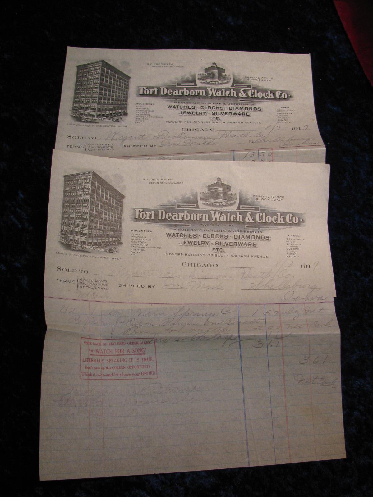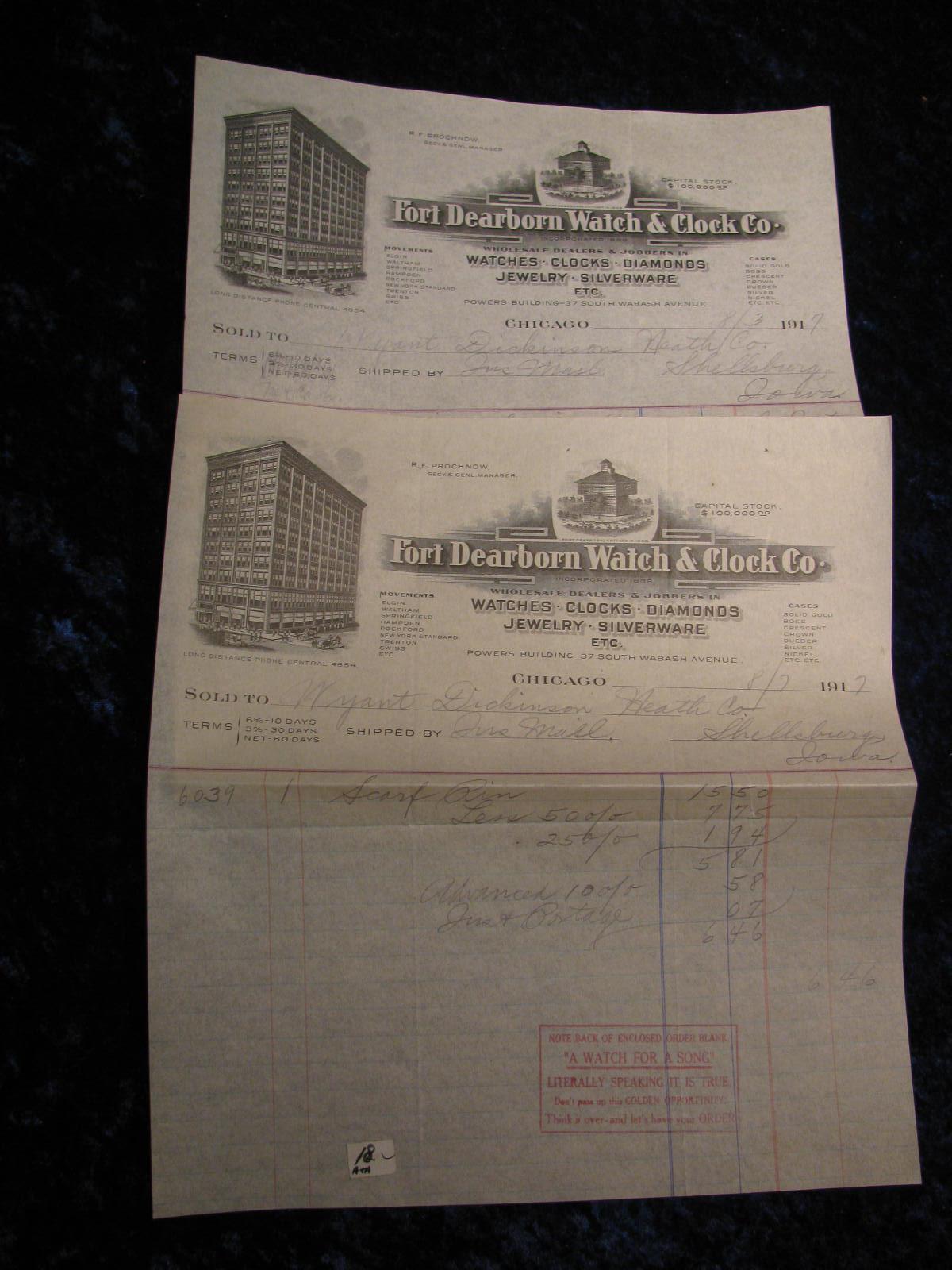 2218. (2) 1917 Invoices, Fort Dearborn Watch & Clock Co.