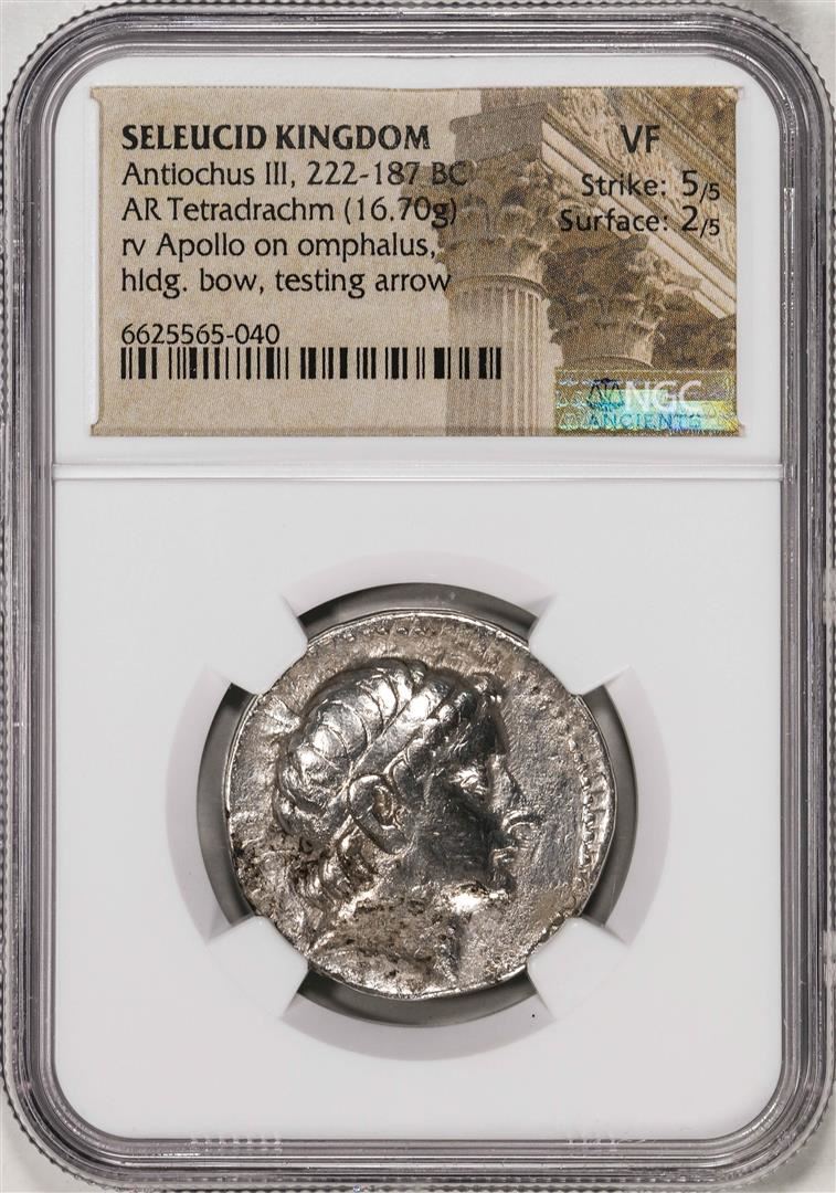 One 222-187 BC Seleucid Kingdom Antiochus III AR Tetradrachm Ancient Coin NGC Ch F. NGC Certified.