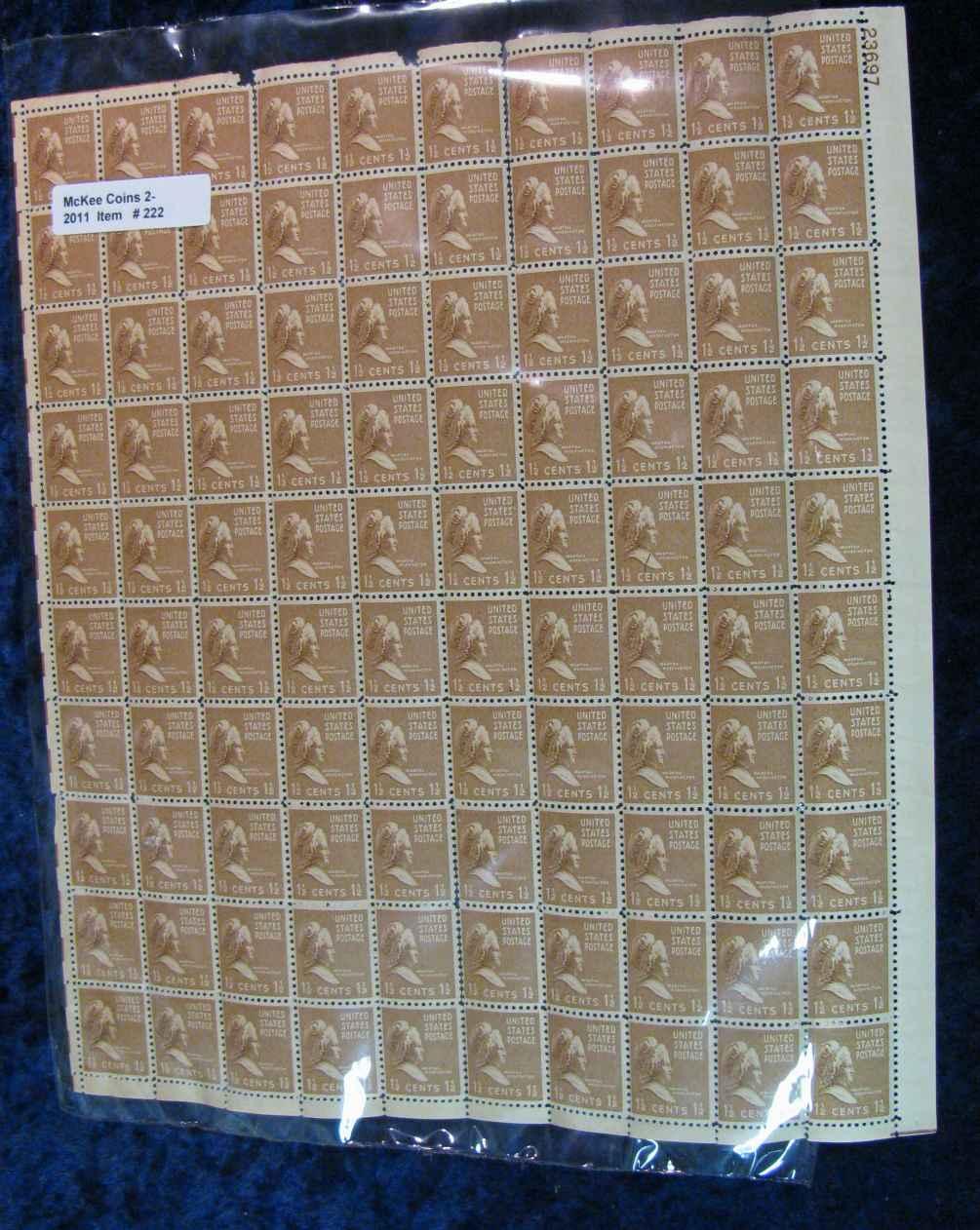 222. Original Mint Sheet of Martha Washington 1 1/2c Stamps. (100 stamps).