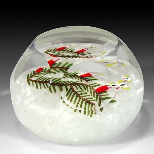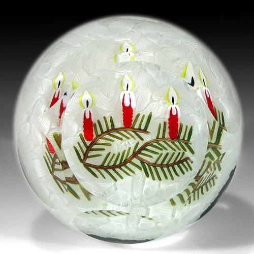 Perthshire Paperweights 1999 Christmas paperweight, with three red candles on a pine branch, over white upset muslin. Six and one facets. Signature/date cane. Limited edition #199 of 200. Diameter 2 5/8". Includes collector certificate. NO RESERVE