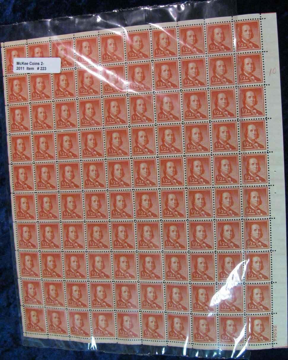 223. Original Mint Sheet of Benjamin Franklin 1/2c Stamps. (100 stamps).