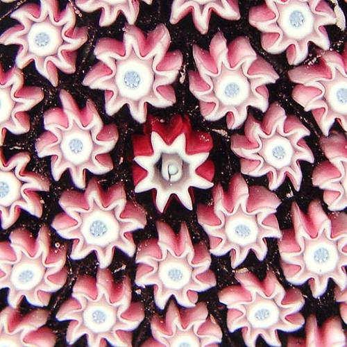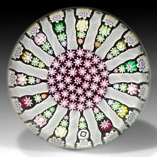 Perthshire Paperweights millefiori cartwheel design paperweight, with a central signature cane encircled by three rings of canes, which are surrounded by radiating white latticinio spokes, dividing rows of canes, on black ground. Diameter 2 7/8". NO RESERVE