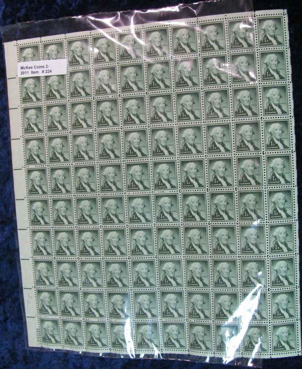224. Original Mint Sheet of George Washington 1c Stamps. (100 stamps).