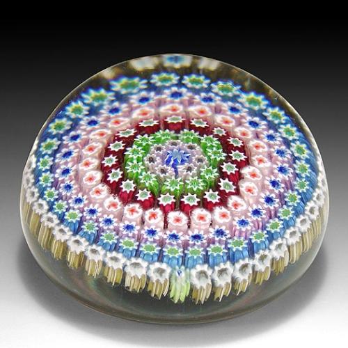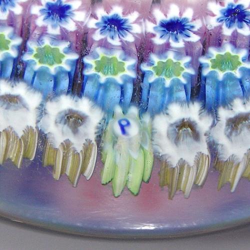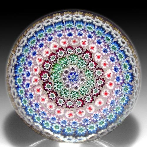 Perthshire Paperweights close concentric millefiori paperweight, with a blue and white cog cane center, encircled by seven concentric rings of assorted complex canes, on clear ground. "P" signature cane in the border ring of canes. Diameter 2 1/2". NO RESERVE