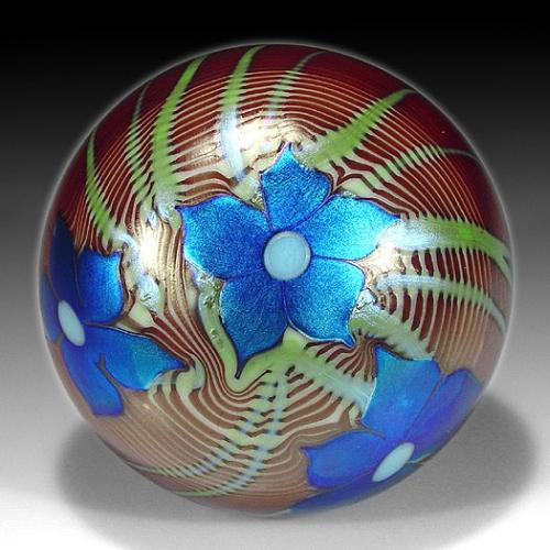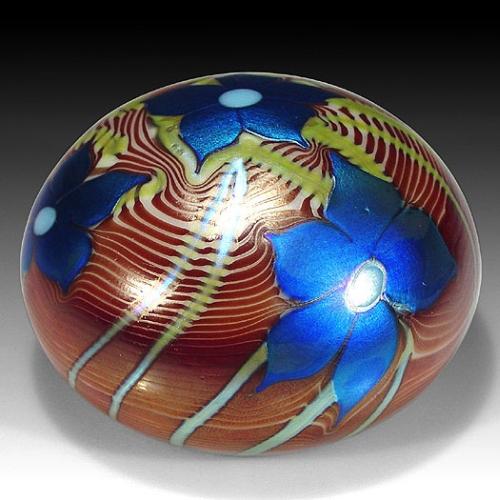 Orient & Flume Art Glass "Flowers and Vines" early surface design paperweight, with three iridescent blue flowers, on pale yellow vines, which trail across an iridescent copper and tan-striped surface. Signed. Diameter 2 5/8". NO RESERVE