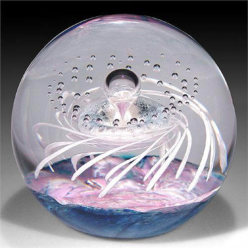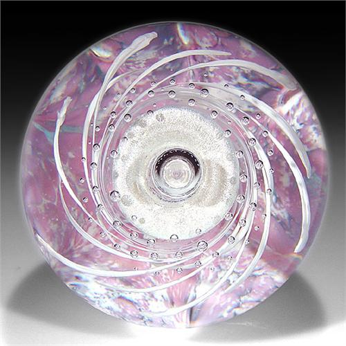 Selkirk Glass 1999 "Snow Queen" abstract design paperweight. The piece contains a large central bubble, floating above a shimmering silver air ring, which is surrounded by tiny spaced bubbles and spiraling white ribbons, over mottled pink, white, and blue ground. Signed/dated. Edition # 317 of a limited edition of 500. Diameter 3 1/2". NO RESERVE
