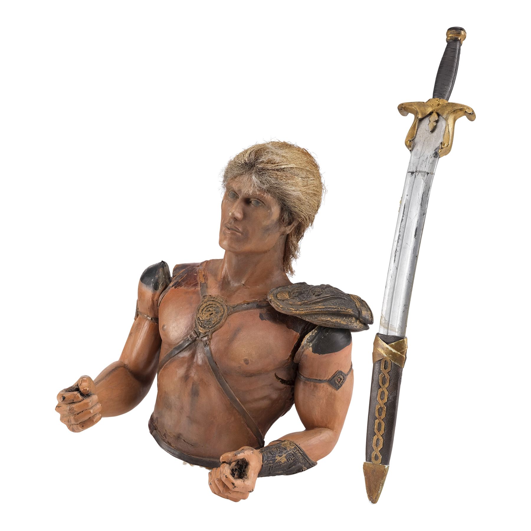 MASTERS OF THE UNIVERSE (1987) - He-Man (Dolph Lundgren) Upper Body Model Miniature - A model miniature of He-Man's (Dolph Lundgren) upper body from Gary Goddard's Masters of the Universe. He-Man piloted a flying disc in the sky battle with Skeletor's henchmen (Frank Langella). The sequence was achieved with a combination of live-action photography, visual effects, and model miniatures.