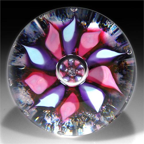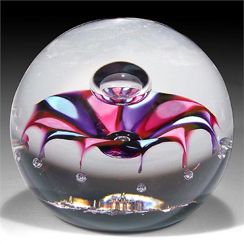 Selkirk Glass 2000 "Duo" flower and bubbles abstract design paperweight. A large bubble is centered over an upright flower, with petals of alternating pink and blue. Another large bubble is positioned at the center of the flower, while a small bubble floats near each outer tip of its petals, over white and gold-speckled black ground. Signed/dated. Edition # 84 of a limited edition of 500. Diameter 3 1/2". NO RESERVE
