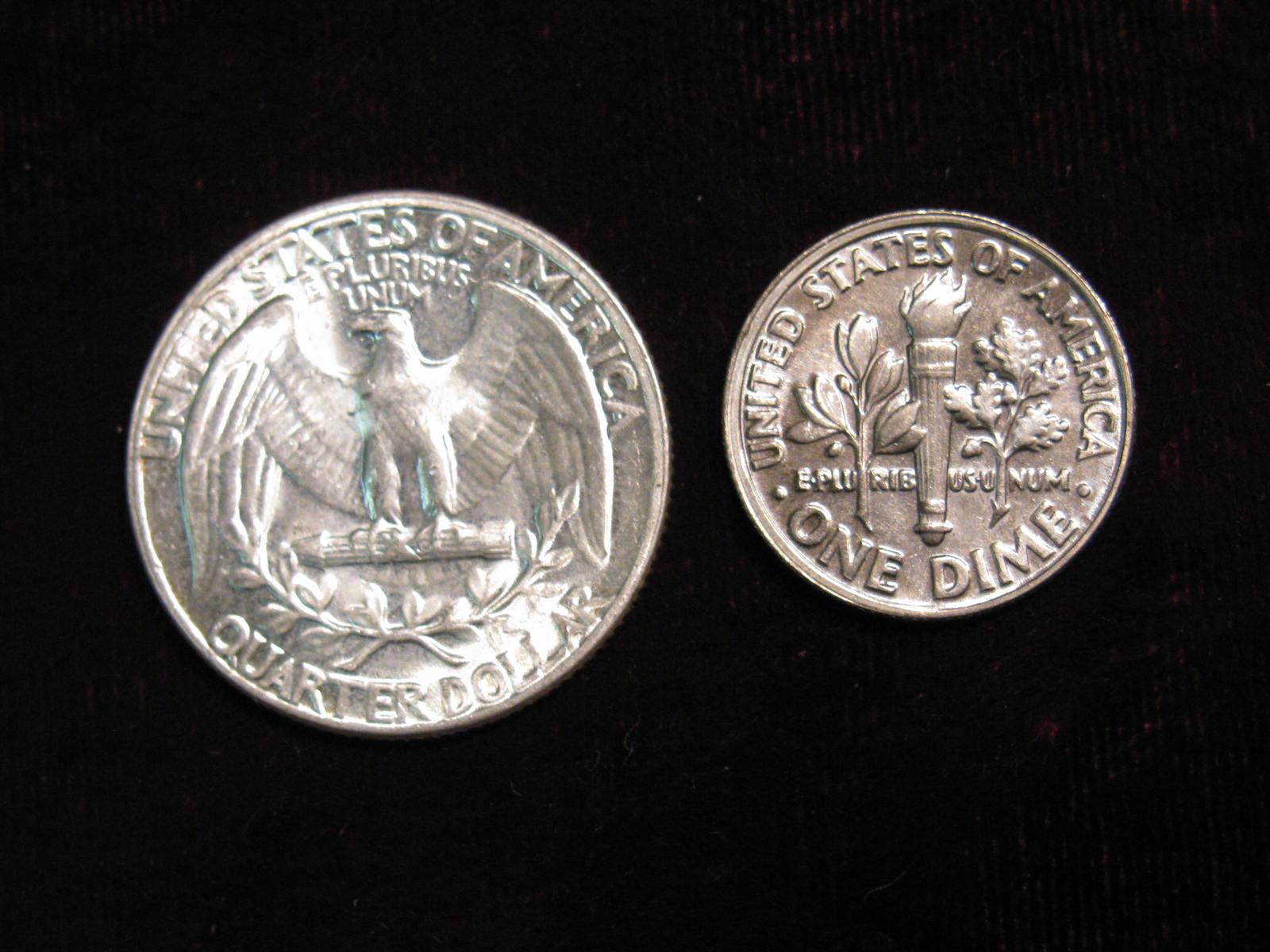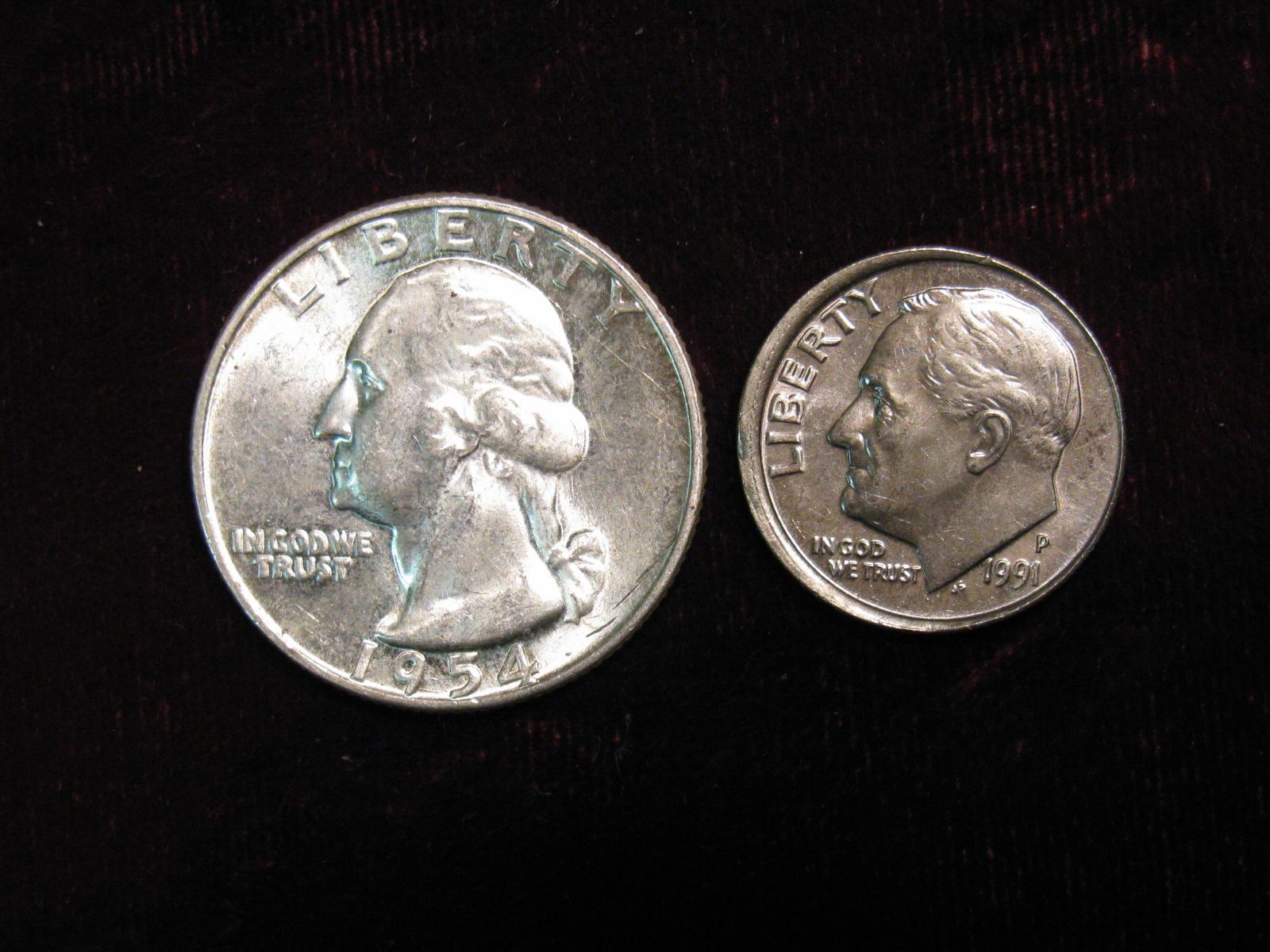 2270. 1954P Quarter & 1991 off Center Dime. UNC.