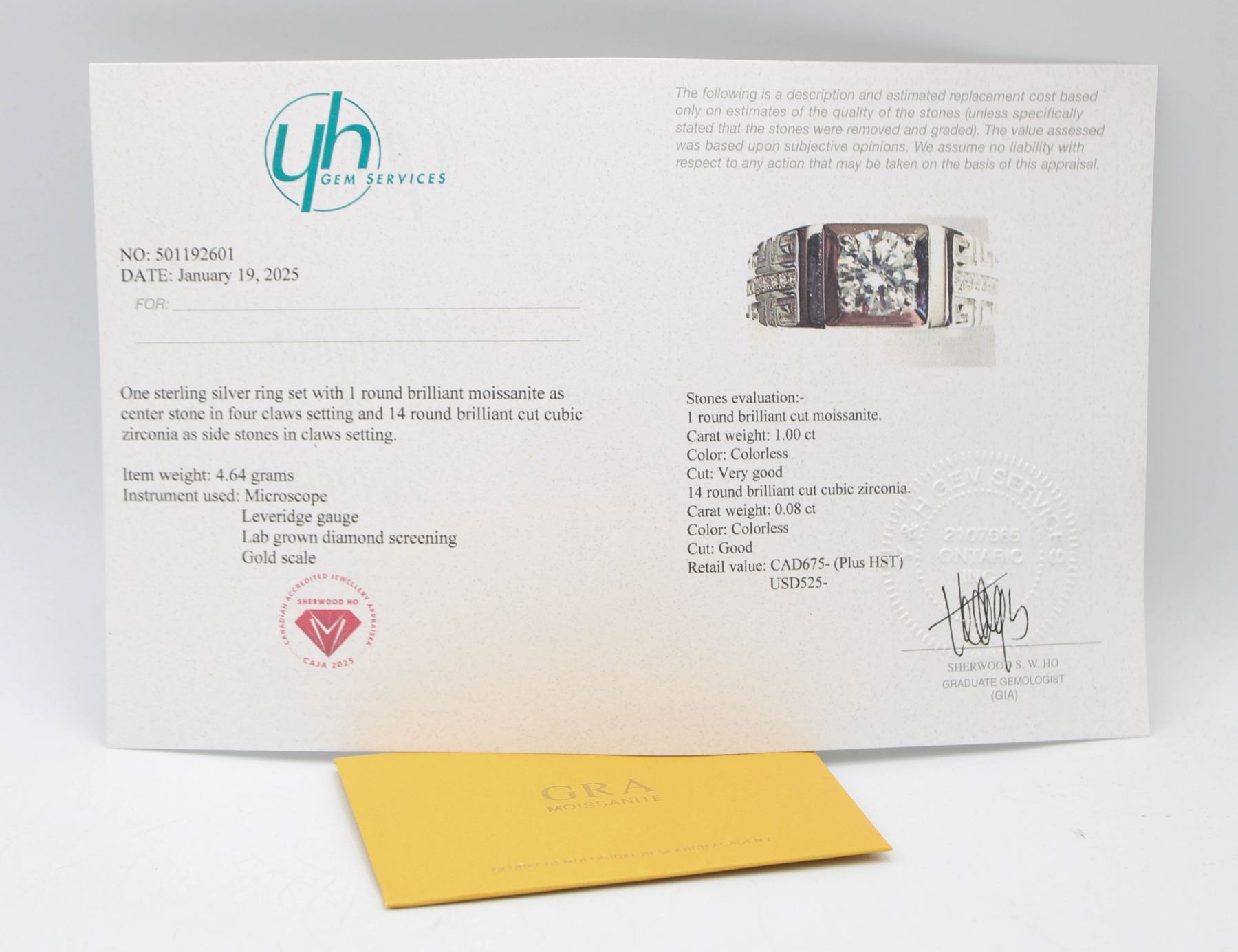 MOISSANITE STONE VVS D COLOR SET WITH 14 ROUND BRILLIANT CUT MOISSANITE SET ON EACH SHANK SET IN 925 SILVER RING SIZE ADJUSTABLE RETAIL VALUE $675.00 **ALL ITEMS MUST BE REMOVED BY 5PM SATURDAY, MARCH 8TH 2025. ALL REMAINING ITEMS WILL BE SUBJECT TO A $6.00 PER DAY STORAGE CHARGE. ANY ITEMS REMAINING AFTER MONDAY, MARCH 24TH 2025 WILL BE CONSIDERED FORFEITED. NO REFUNDS WILL BE ISSUED FOR FORFEITED ITEMS. TO SCHEDULE A PICK UP APPOINTMENT CLICK HERE
