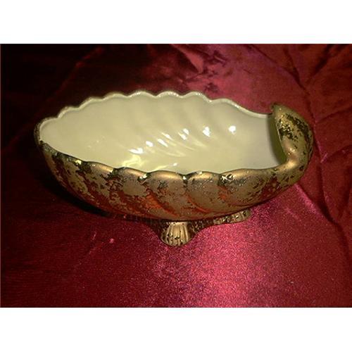 22 K Gold Leaf Porcelain Dish. Measures 7.5" long by 4.25" wide by 3" tall. In great condition. Numbered and hall marked on bottom.