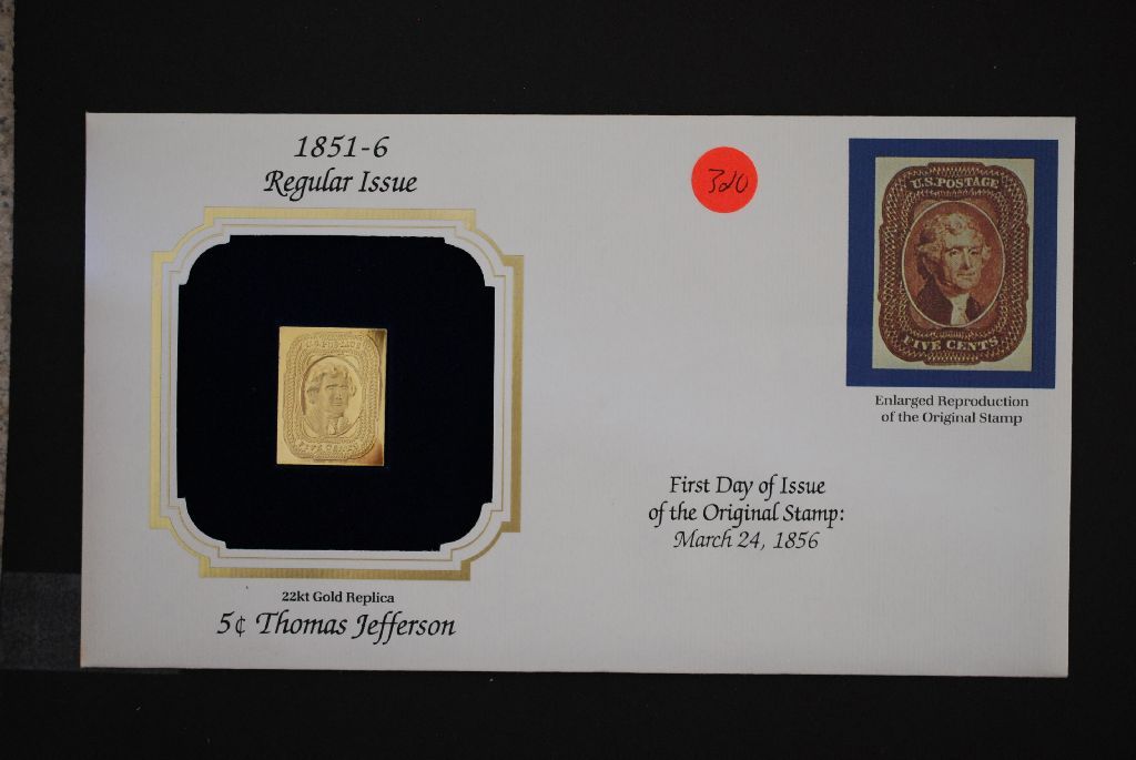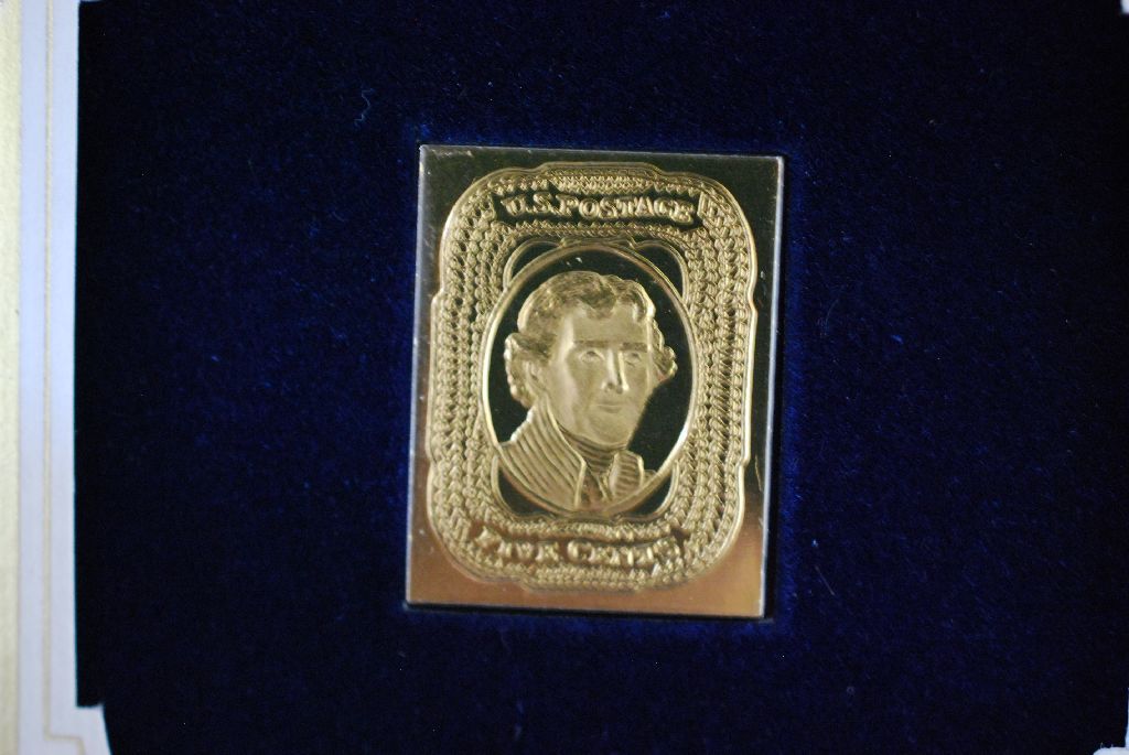 22K Gold Replica Stamp W/Enlarged Reproduction of Original Stamp; First Day Issue Original Stamp-1856; 5 Cent Thomas Jefferson