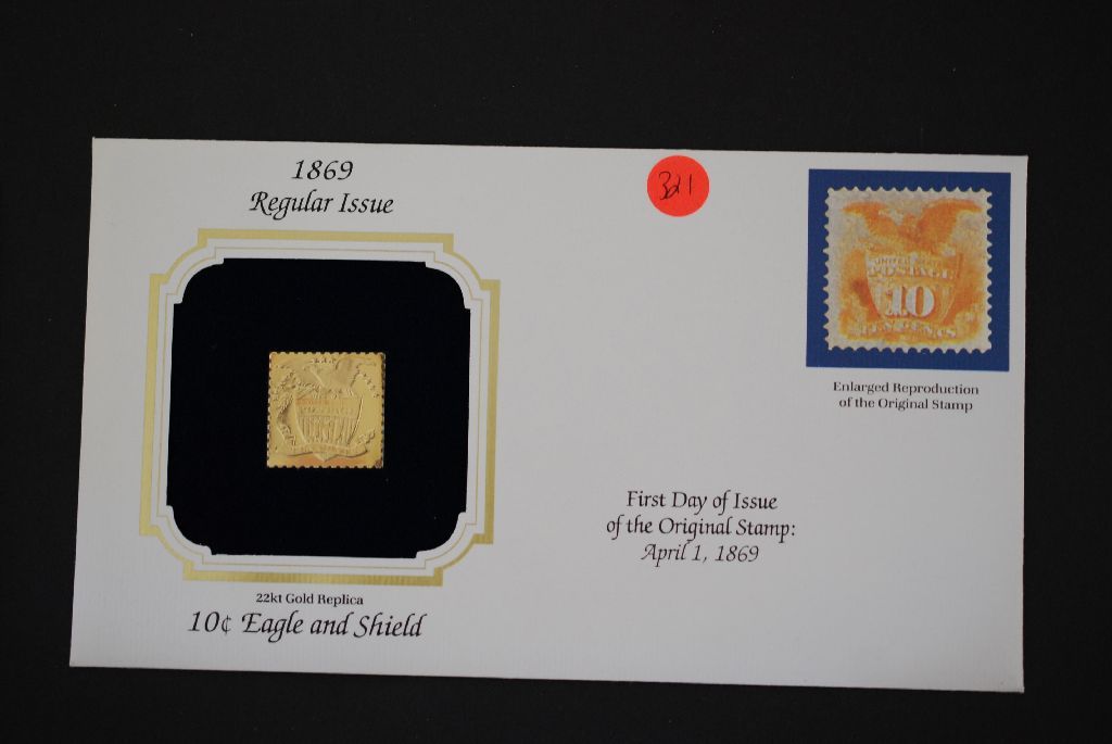 22K Gold Replica Stamp W/Enlarged Reproduction of Original Stamp; First Day Issue Original Stamp-1869; 10 Cent Eagle And Shield