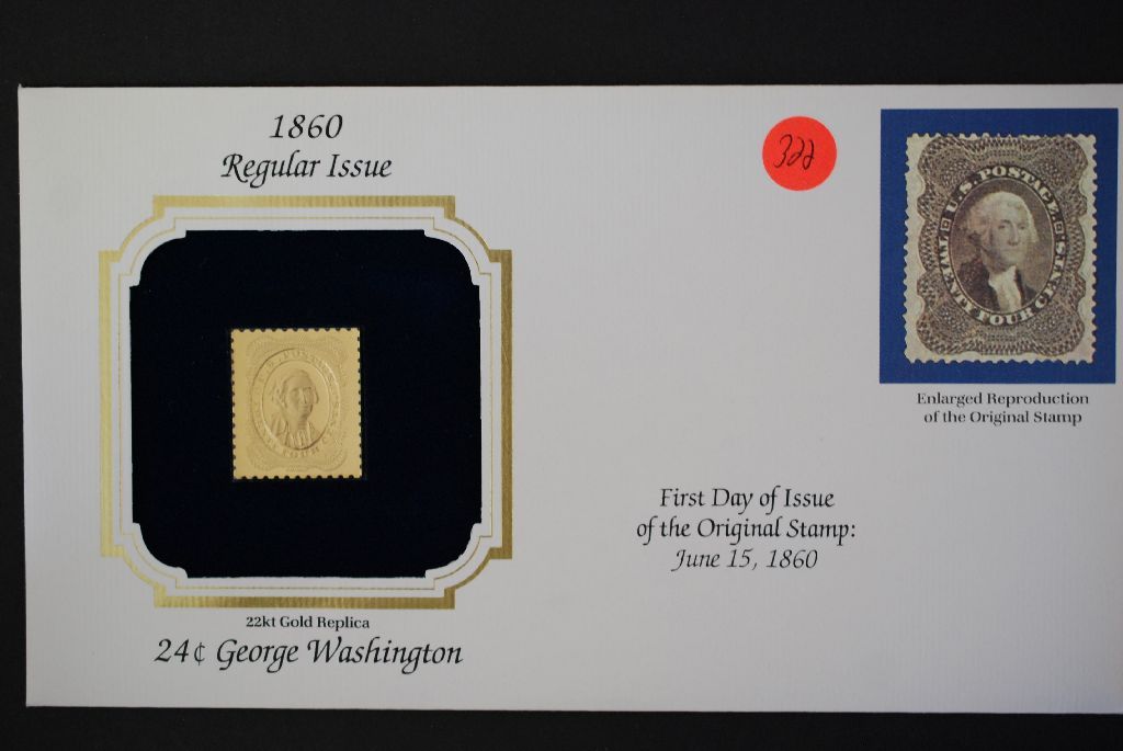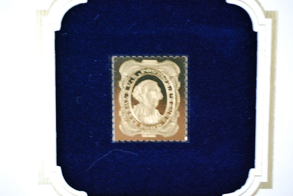 22K Gold Replica Stamp W/Enlarged Reproduction of Original Stamp; First Day Issue Original Stamp-1860; 24 Cent George Washington