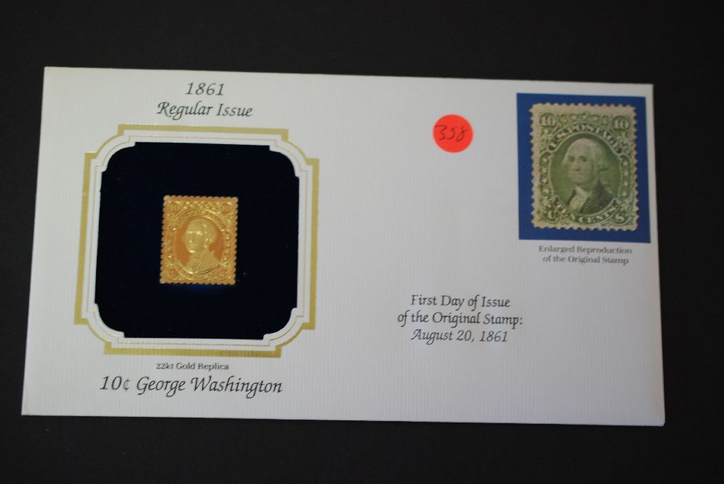 22K Gold Replica Stamp W/Enlarged Reproduction of Original Stamp; First Day Issue Original Stamp-1861; 10 Cent George Washington
