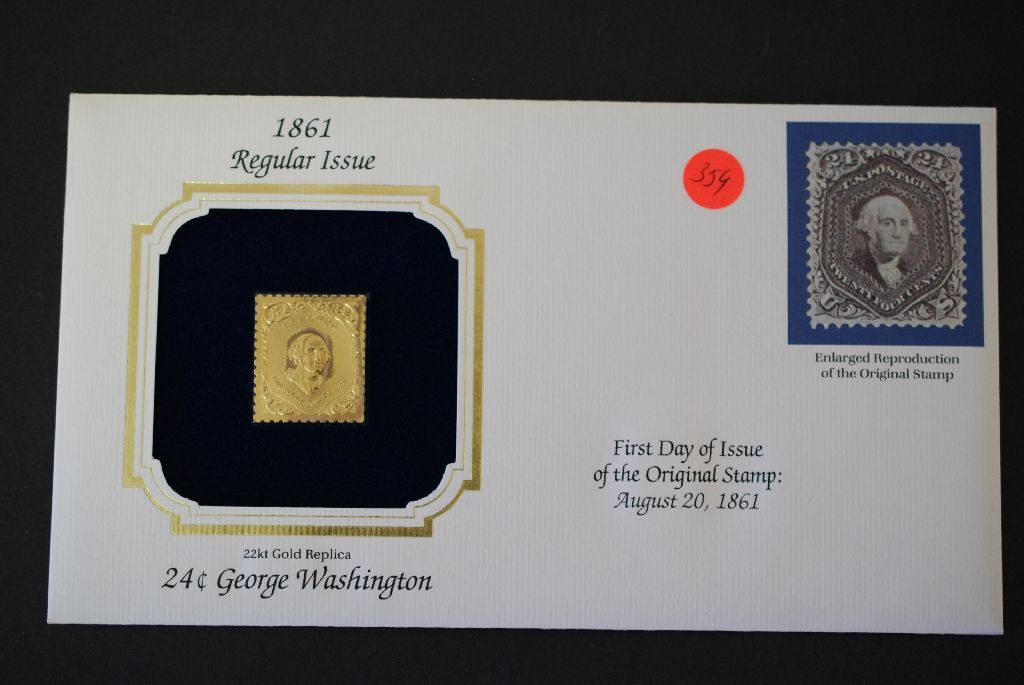 22K Gold Replica Stamp W/Enlarged Reproduction of Original Stamp; First Day Issue Original Stamp-1861; 24 Cent George Washington