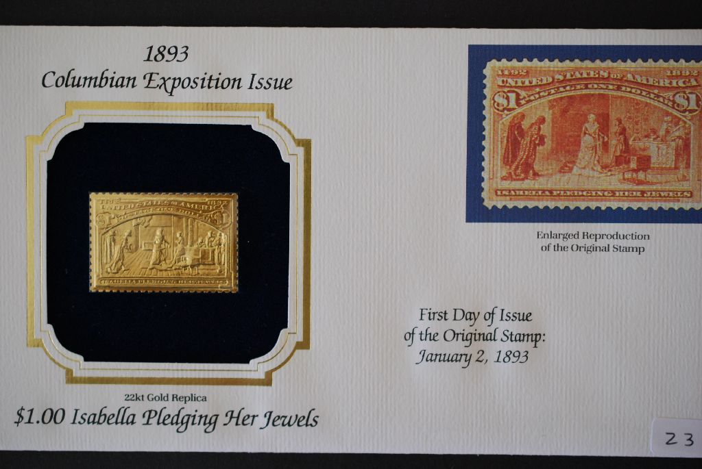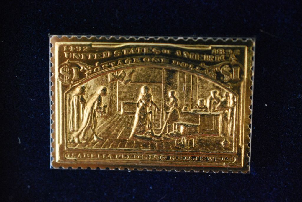 22K Gold Replica Stamp W/Enlarged Reproduction of Stamp; Original Issue Date 1893; $1.00 Isabella Pledging Her Jewels