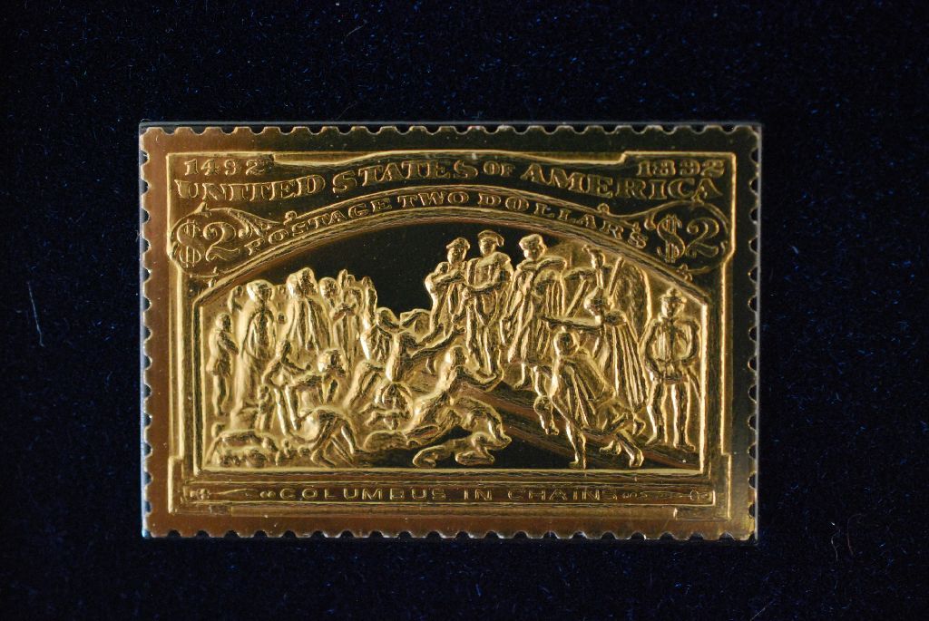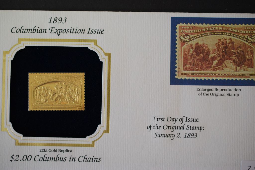 22K Gold Replica Stamp W/Enlarged Reproduction of Stamp; Original Issue Date 1893; $2.00 Columbus In Chains
