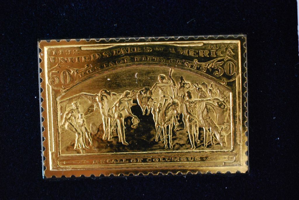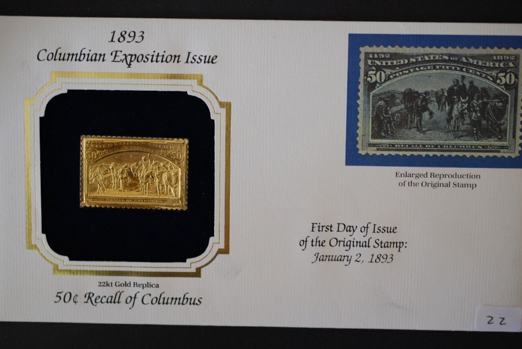 22K Gold Replica Stamp W/Enlarged Reproduction of Stamp; Original Issue Date 1893; 50 Cent Recall Of Columbus
