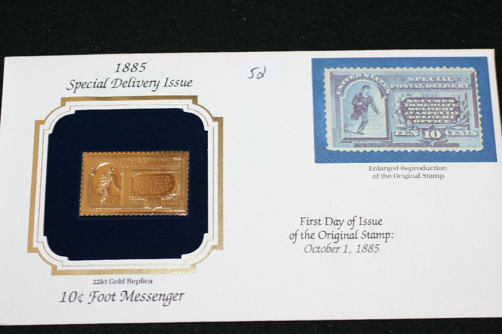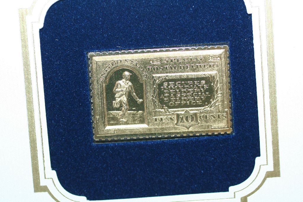 22K Gold Replica Stamp W/Enlarged Reproduction of the Original Stamp Issued 1885; 10 Cent Foot Messenger