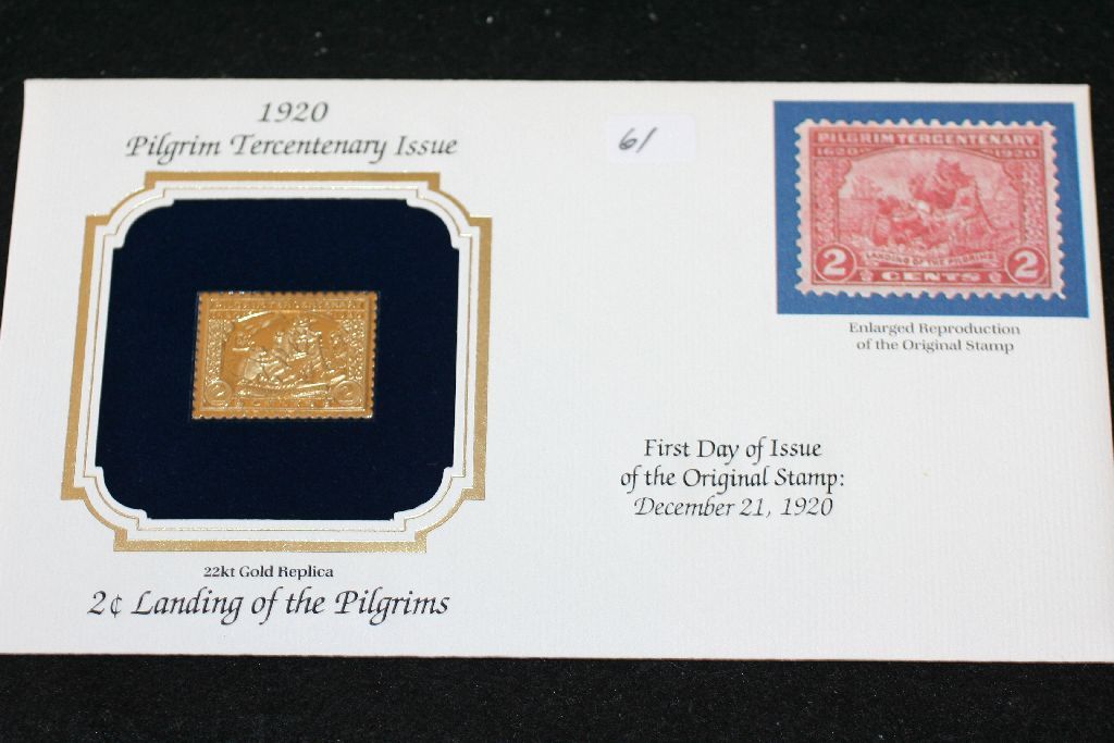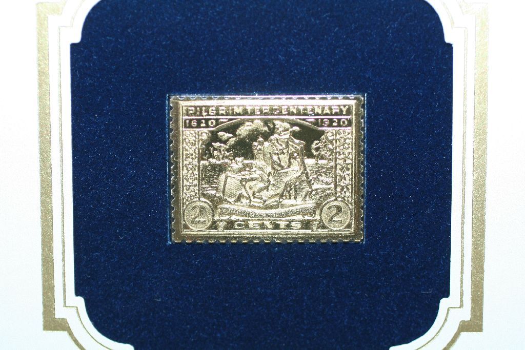 22K Gold Replica Stamp W/Enlarged Reproduction of the Original Stamp Issued 1920; 2 Cent Landing of the Pilgrims