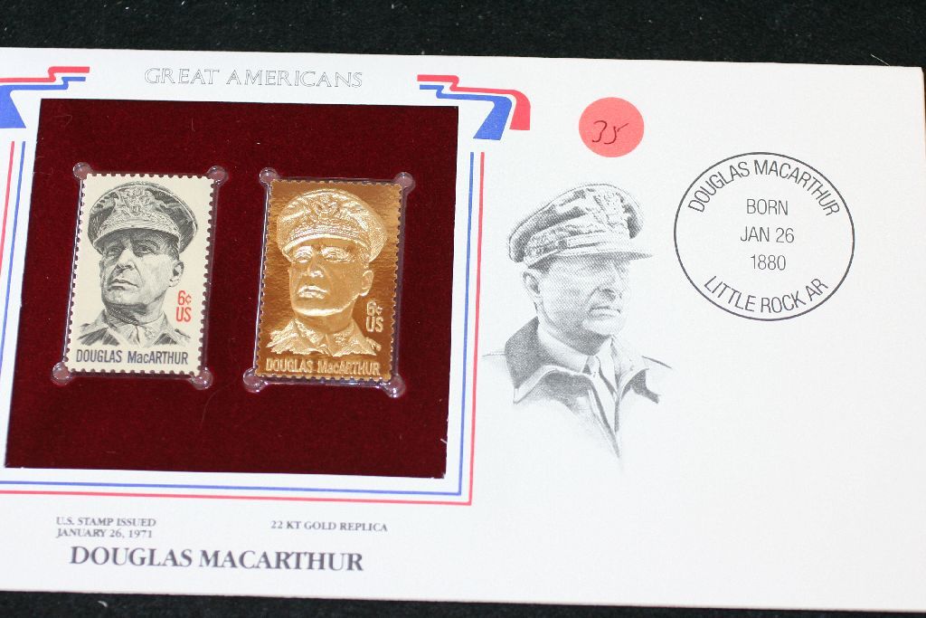 22K Gold Replica Stamp W/Postal Stamp Issued 1971; Douglas Macarthur-Great Americans