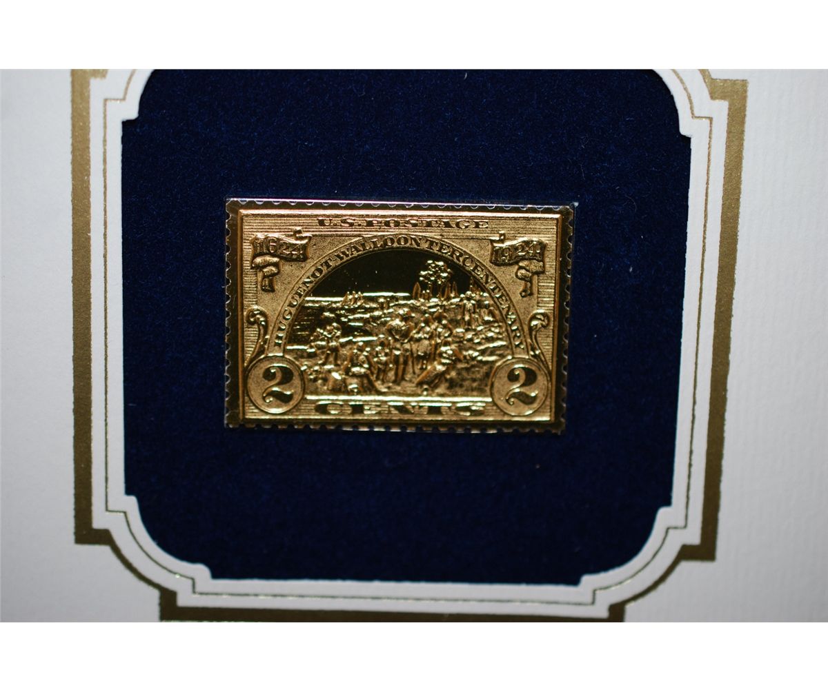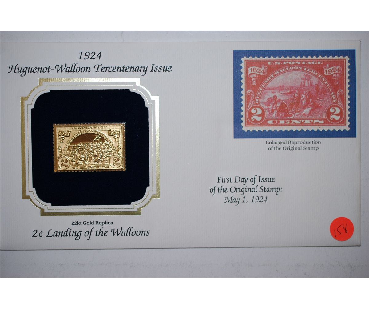 22K Gold Replica Stamp With Enlarged Reproduction Of Original Stamp; Original Date of First Day Issue May 1, 1924; 2 Cent Landing Of The Walloons; EST. $5-10