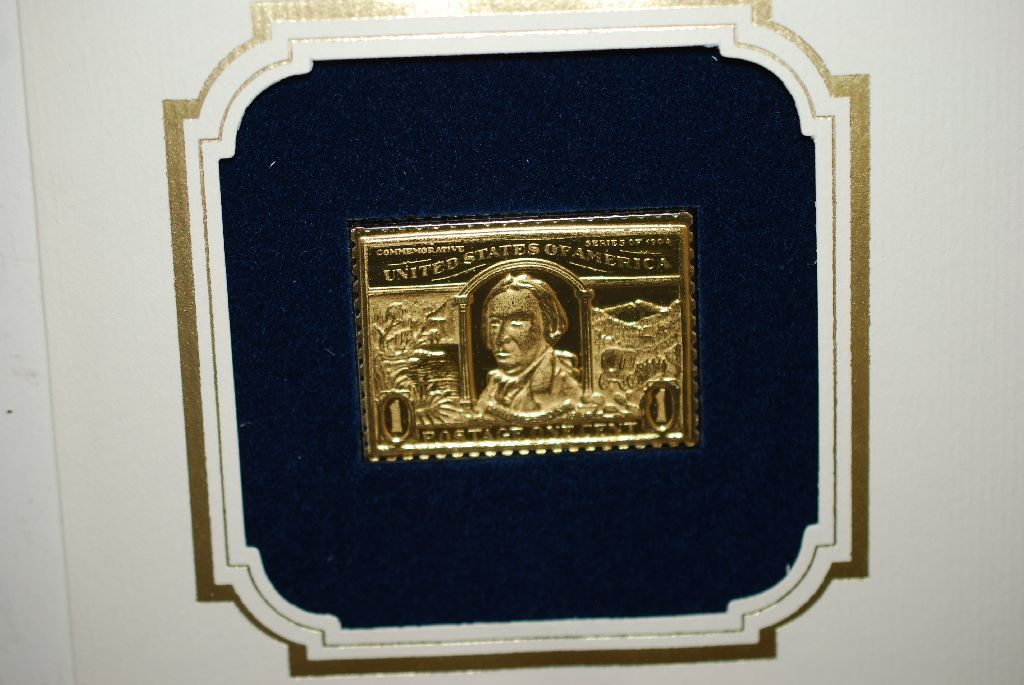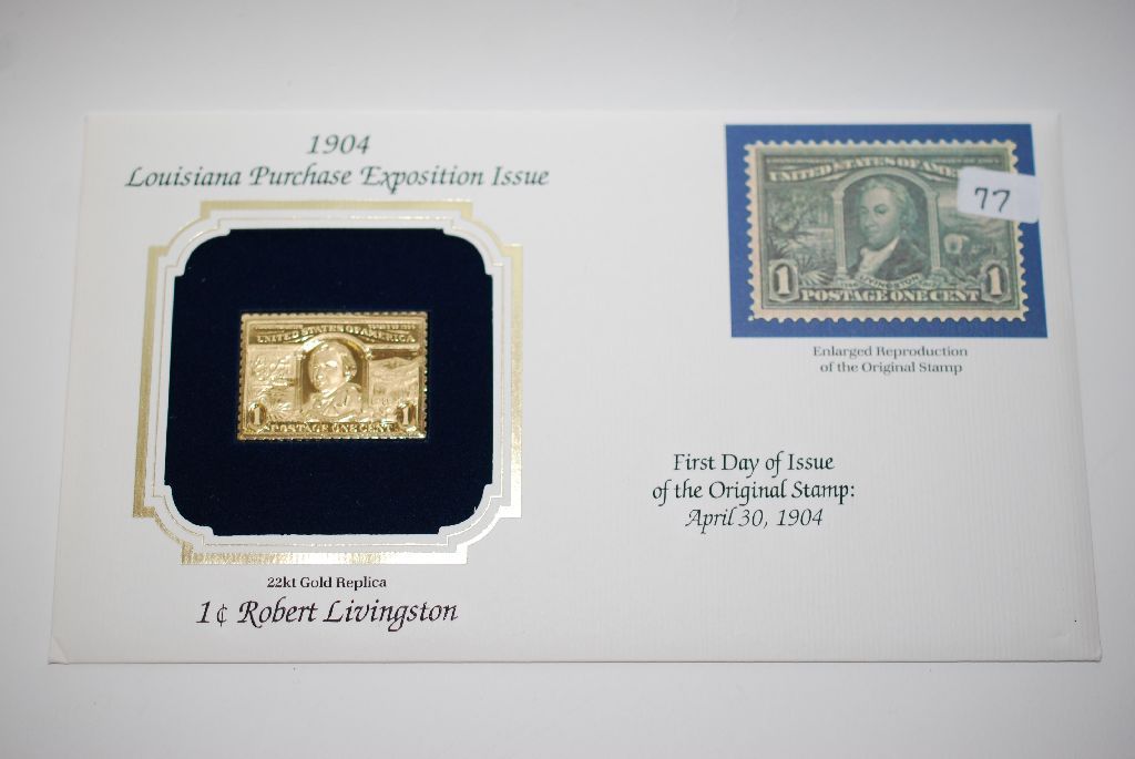 22K Gold Replica Stamp With Enlarged Reproduction Of The Original Stamp; First Day Issue Of Original Stamp April 30, 1904; 1 Cent Robert Livingston; EST. $5-10