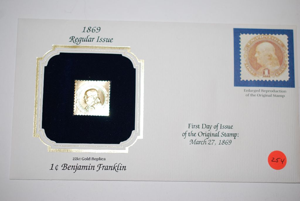 22K Gold Replica Stamp With Enlarged Reproduction Of The Original Stamp; Original Date Of Issue March 27, 1869; 1 Cent Benjamin Franklin Stamp; EST. $5-10