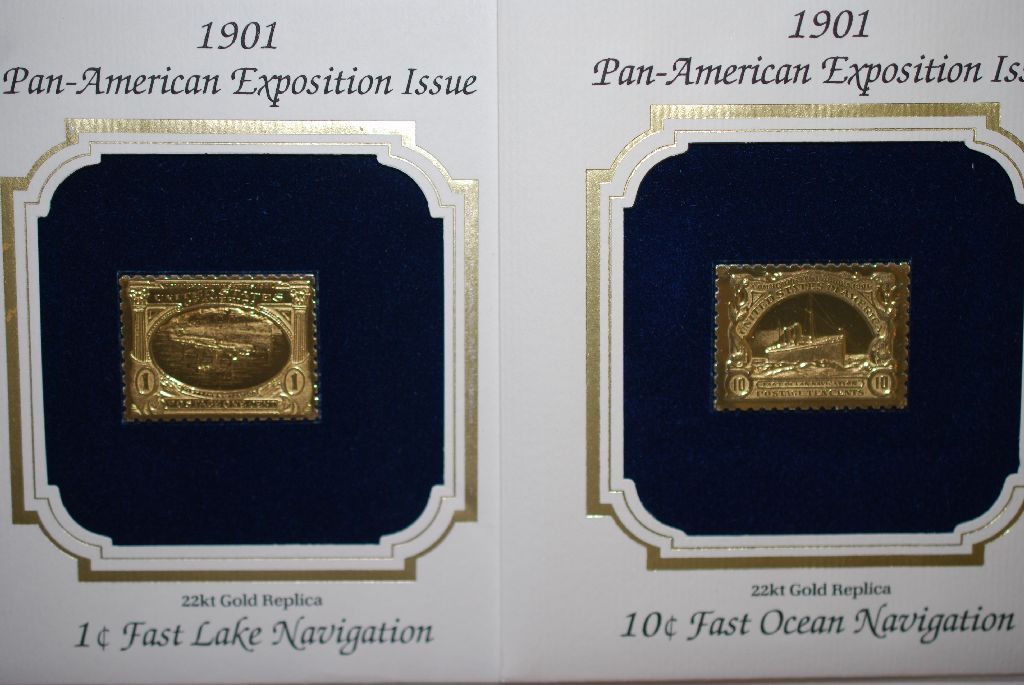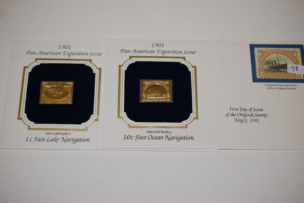 22K Gold Replica With Enlarged Reproduction Of The Original Stamp; First Day Issue Of Original Stamp May 1, 1901, 10 Cent Fast Ocean Navigation & May 1, 1901, 1 Cent Fast Lake Navigation; Lot of 2; EST. $10-20