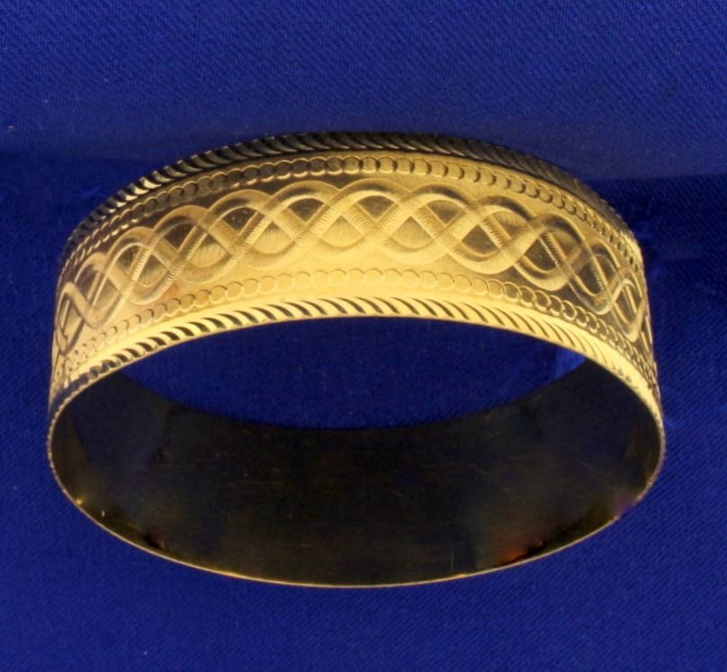 In 22k yellow gold, 2 3/8 inch diameter and 20mm wide. Unique etched design. 37.5g.