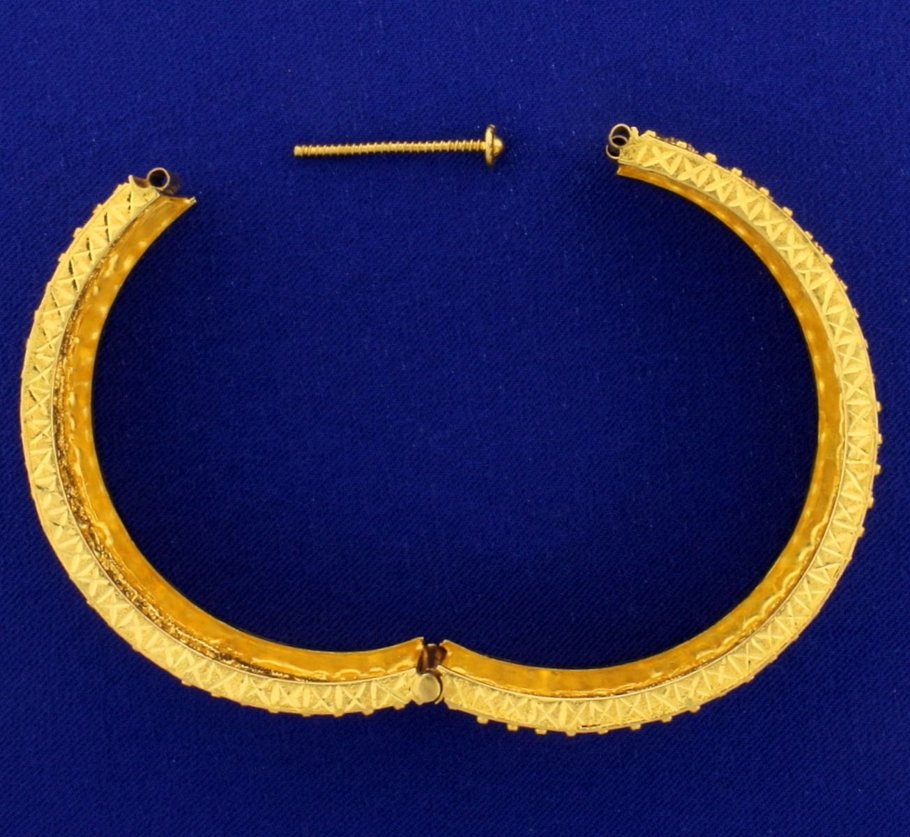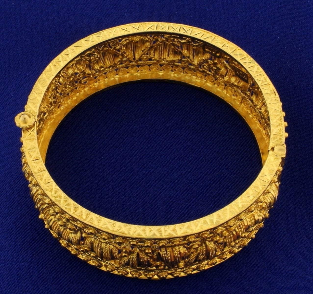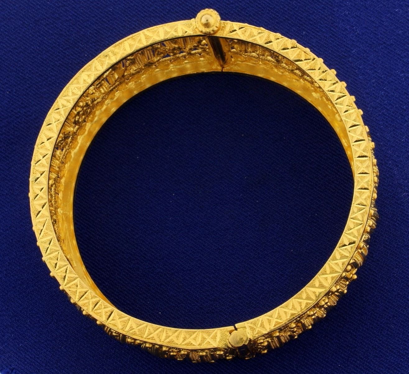 In 22K Yellow Gold. 21mm wide. Screw safety clasp. hinges, open/close. 2 1/4 inch inside diameter. 52.4g