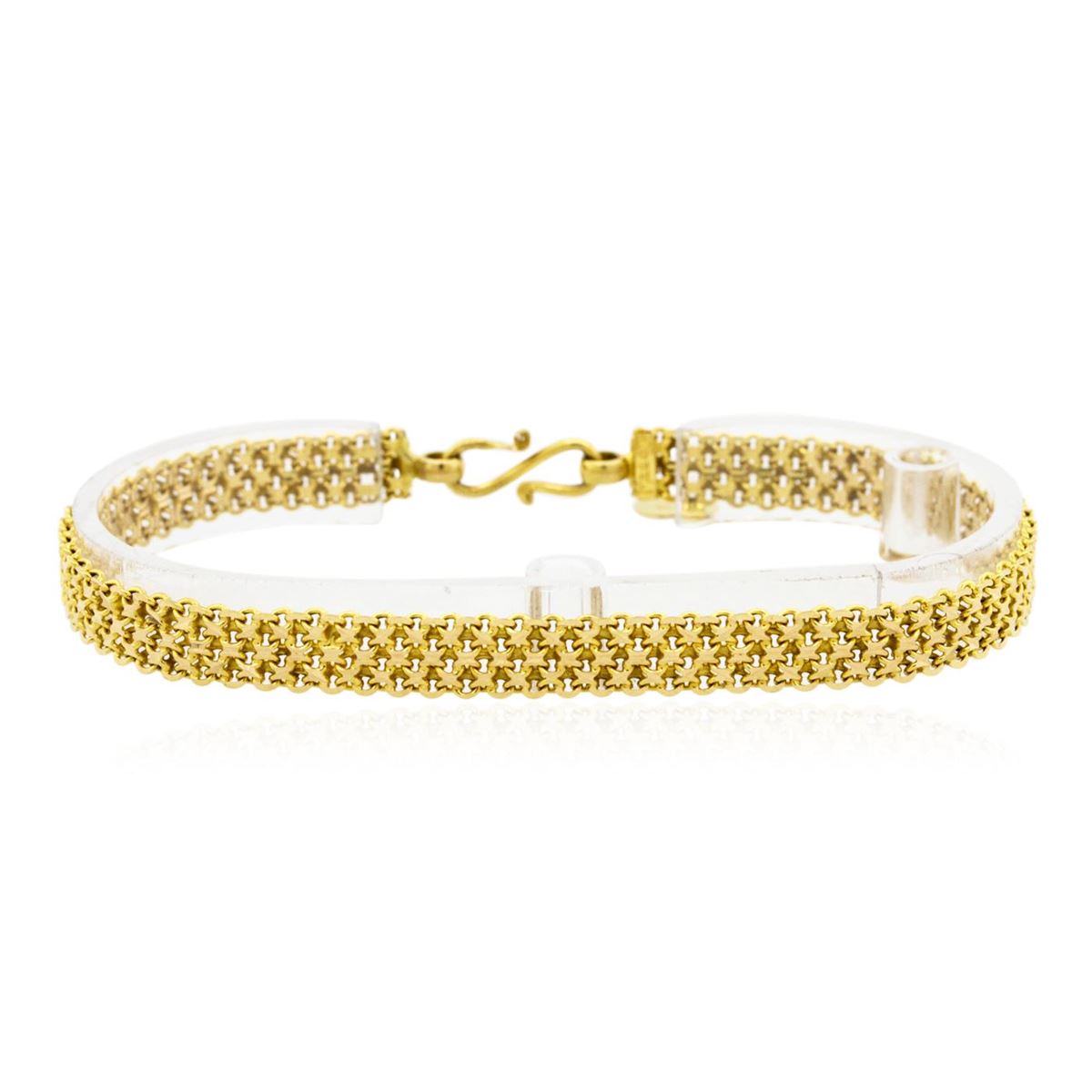 One 22KT Yellow Gold Fancy Link Bracelet weighing 12.00 grams containing a dangling heart charm with a bright polish finish and terminating in a S fishhook clasp.