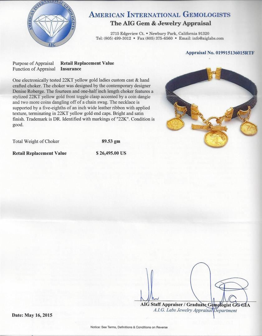 One electronically tested 22KT yellow gold ladies custom cast & hand crafted choker. The choker was designed by the contemporary designer Denise Roberge. The fourteen and one-half inch length choker features a stylized 22KT yellow gold front toggle clasp accented by a coin dangle and two more coins dangling off of a chain swag. The necklace is supported by a five-eighths of an inch wide leather ribbon with applied texture, terminating in 22KT yellow gold end caps. Bright and satin finish. Trademark is DR. Identified with markings of "22K". Condition is good. Total Weight of Choker: 89.53 gm. AIG Appraised at $26,495.00.
