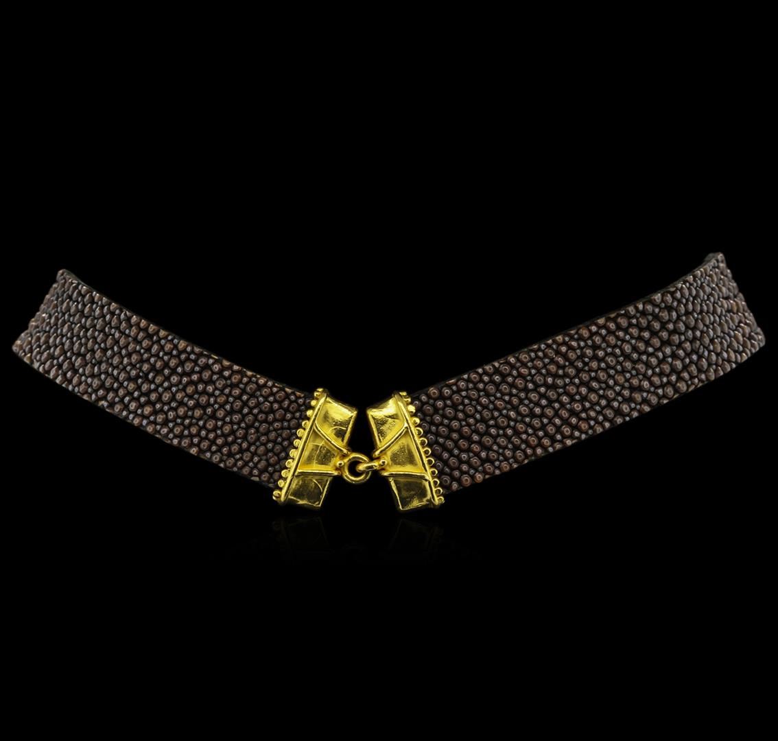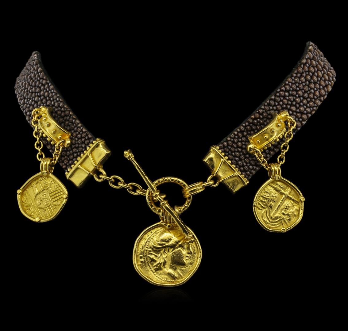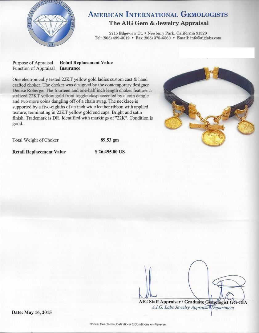 One electronically tested 22KT yellow gold ladies custom cast & hand crafted choker. The choker was designed by the contemporary designer Denise Roberge. The fourteen and one-half inch length choker features a stylized 22KT yellow gold front toggle clasp accented by a coin dangle and two more coins dangling off of a chain swag. The necklace is supported by a five-eighths of an inch wide leather ribbon with applied texture, terminating in 22KT yellow gold end caps. Bright and satin finish. Trademark is DR. Identified with markings of "22K". Condition is good. Total Weight of Choker: 89.53 gm. AIG Appraised at $26,495.00.