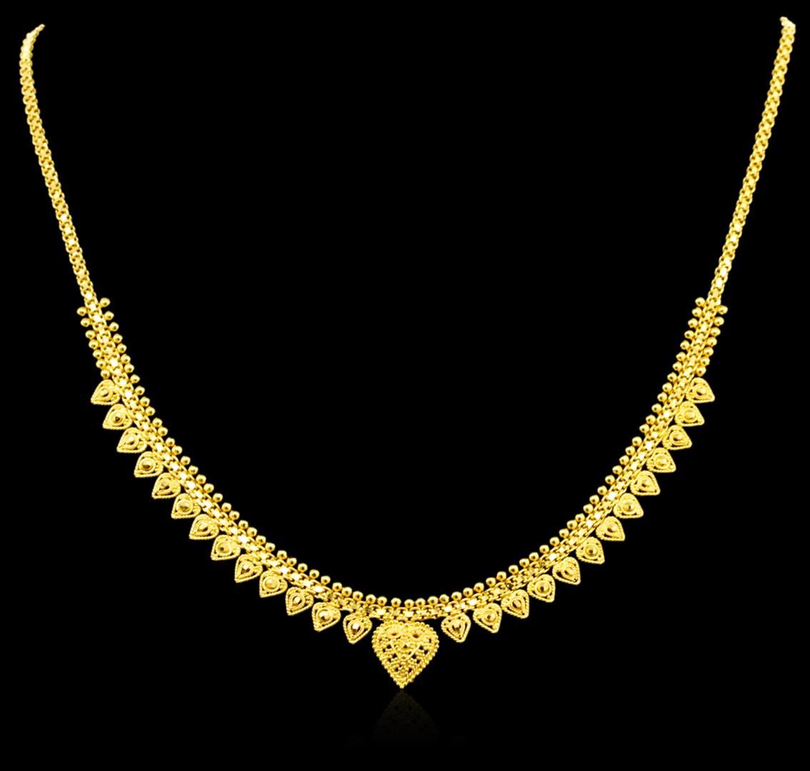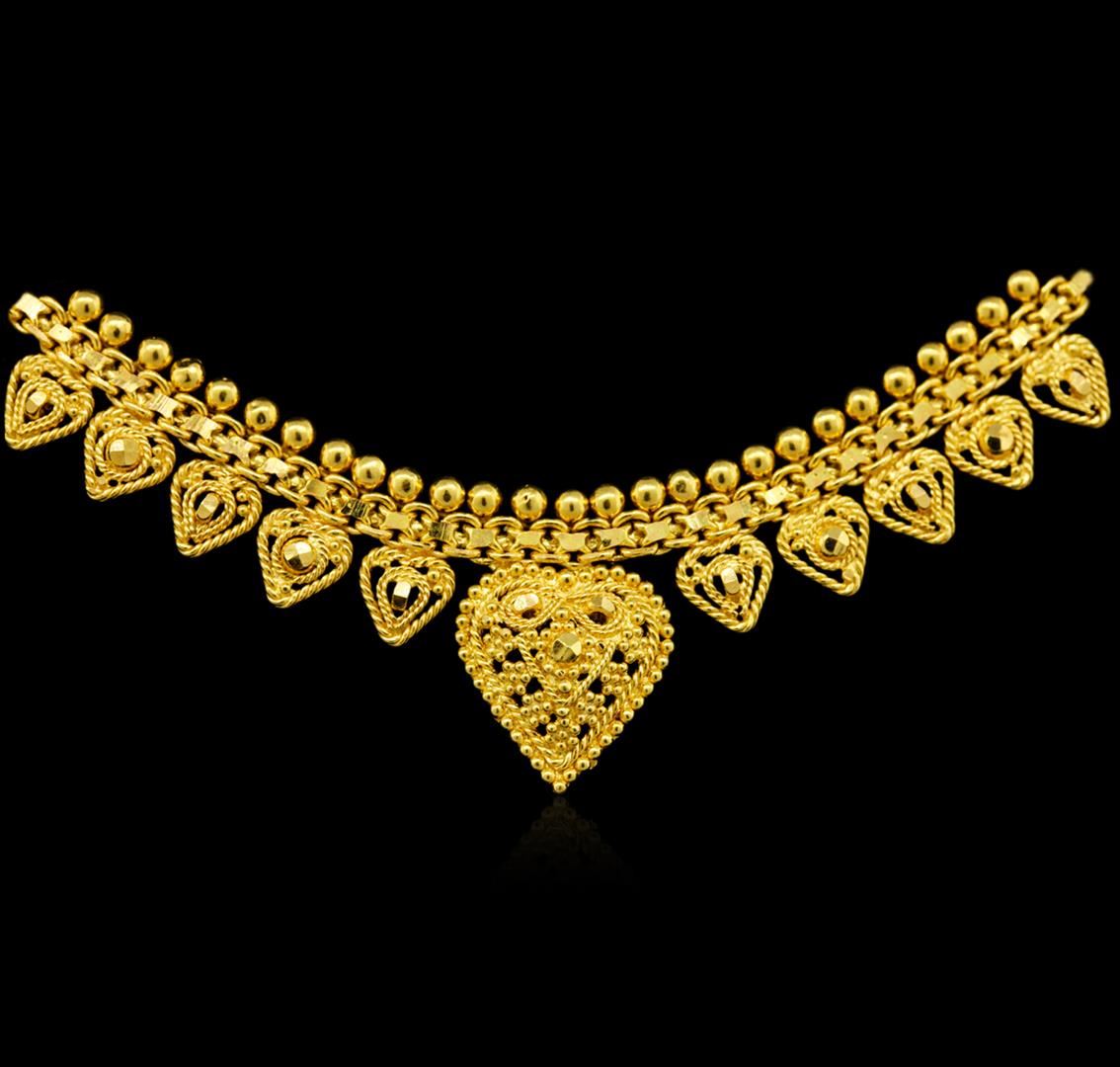 One 22KT Yellow Gold Fancy Flat Link and Beaded Necklace with 27 Hearts measuring 15-1/2" in length and weighs 13.00 grams.