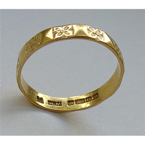 This distinctive gold band features alternating incised four-leafed motifs and pyramidal squares. The inside is fully marked including marks for 22K gold, Birmingham