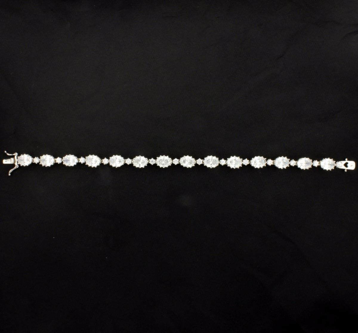 In sterling silver, the bracelet is 7 1/2 inches long and contains fourteen 1.5ct oval and fourteen .1ct round CZs. 15.5g
