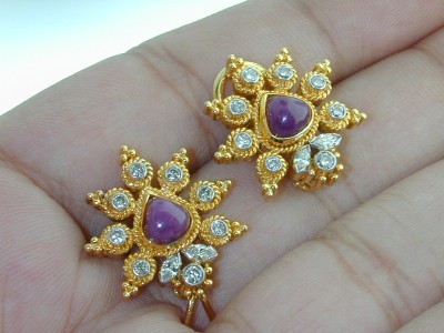 22K Two Toned (Yellow-White) Gold, Cabochon Ruby, Diamond Earrings The total Earrings' weight is 13.7 grams. The total weight of the Diamond is 0.75 cts approxmiately, G color VS clarity. Total weight of Cabochon Ruby is 2.75 ct. approximately. The size of the earring is 19 x 20 mm, 5 mm in Thickness.