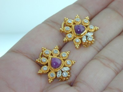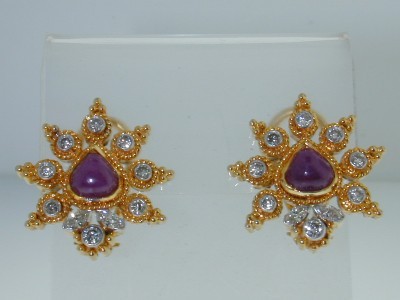 22K Two Toned (Yellow-White) Gold, Cabochon Ruby, Diamond Earrings The total Earrings' weight is 13.7 grams. The total weight of the Diamond is 0.75 cts approxmiately, G color VS clarity. Total weight of Cabochon Ruby is 2.75 ct. approximately. The size of the earring is 19 x 20 mm, 5 mm in Thickness.