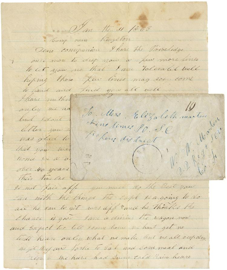 Civil War letter by Confederate soldier William Martin of the 22nd South Carolina Infantry. The two page letter dated 11 January 1863 was written at a camp near Kingston and the cover bears the regimental ID. It reads in part, ��I was in the battle all day and bombs and the grapeshot and the bullets fell around me as thick as rain ever did the 14th December�� The letter is folded into thirds and has foxing, light toning and chipping at the perimeter. Vero has tape repair to horizontal foldline and vertical foldlines contains tears. Overall good condition.