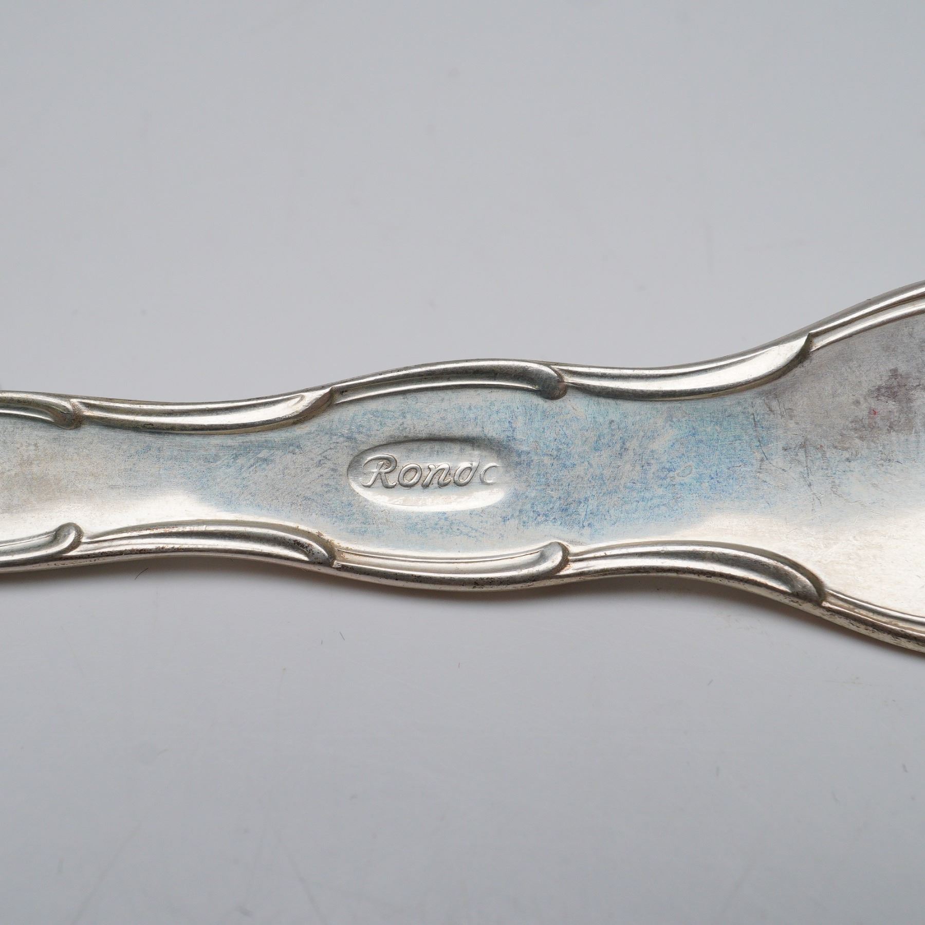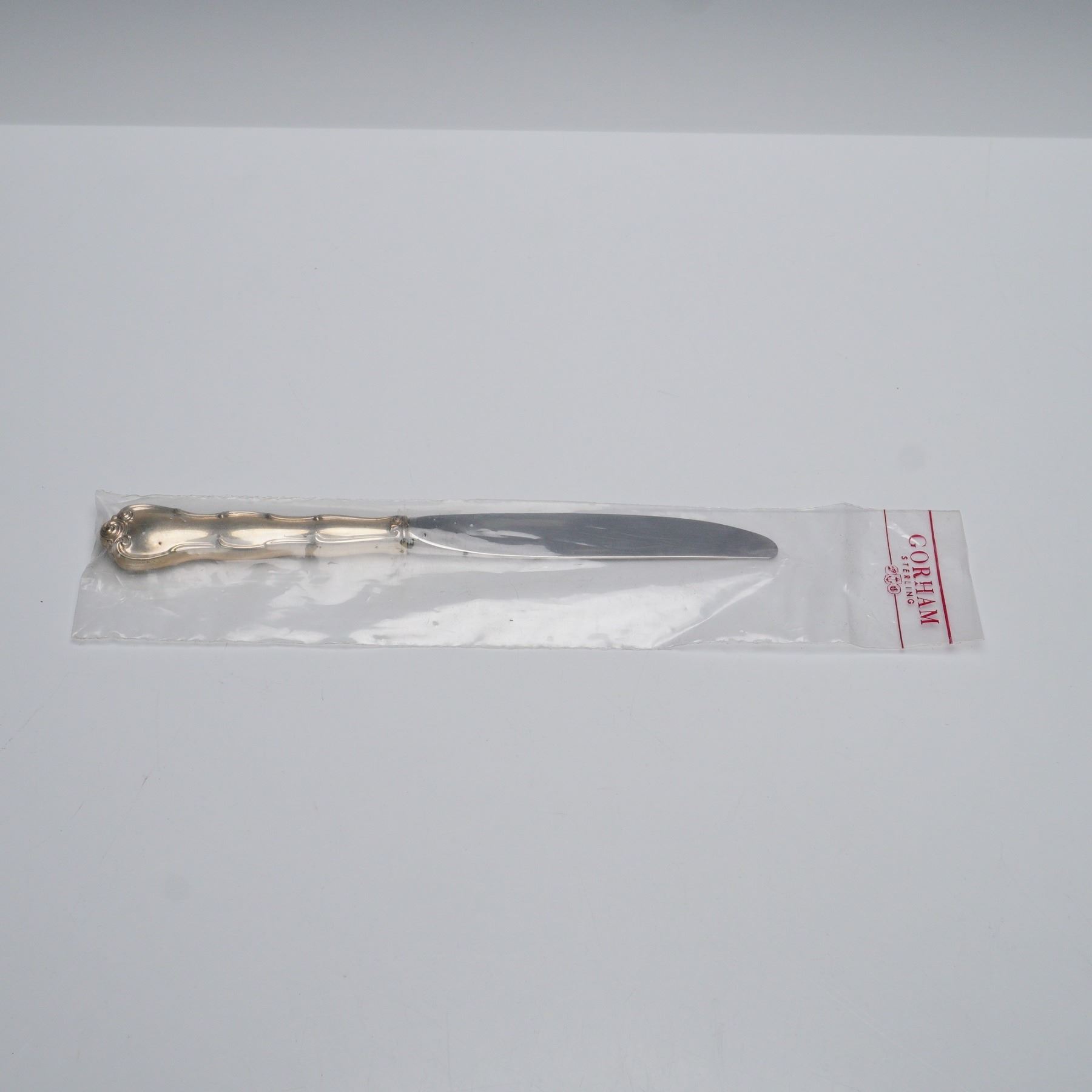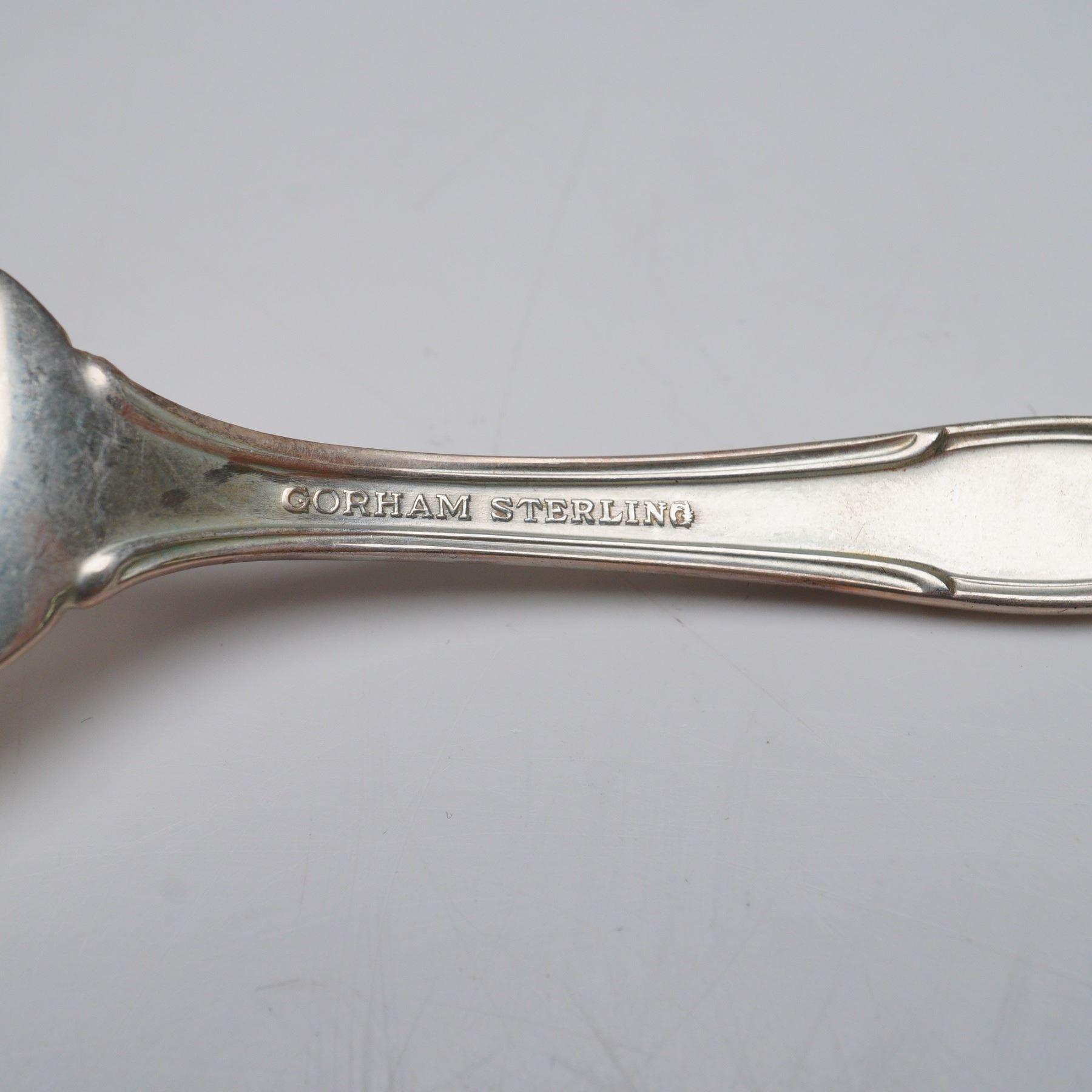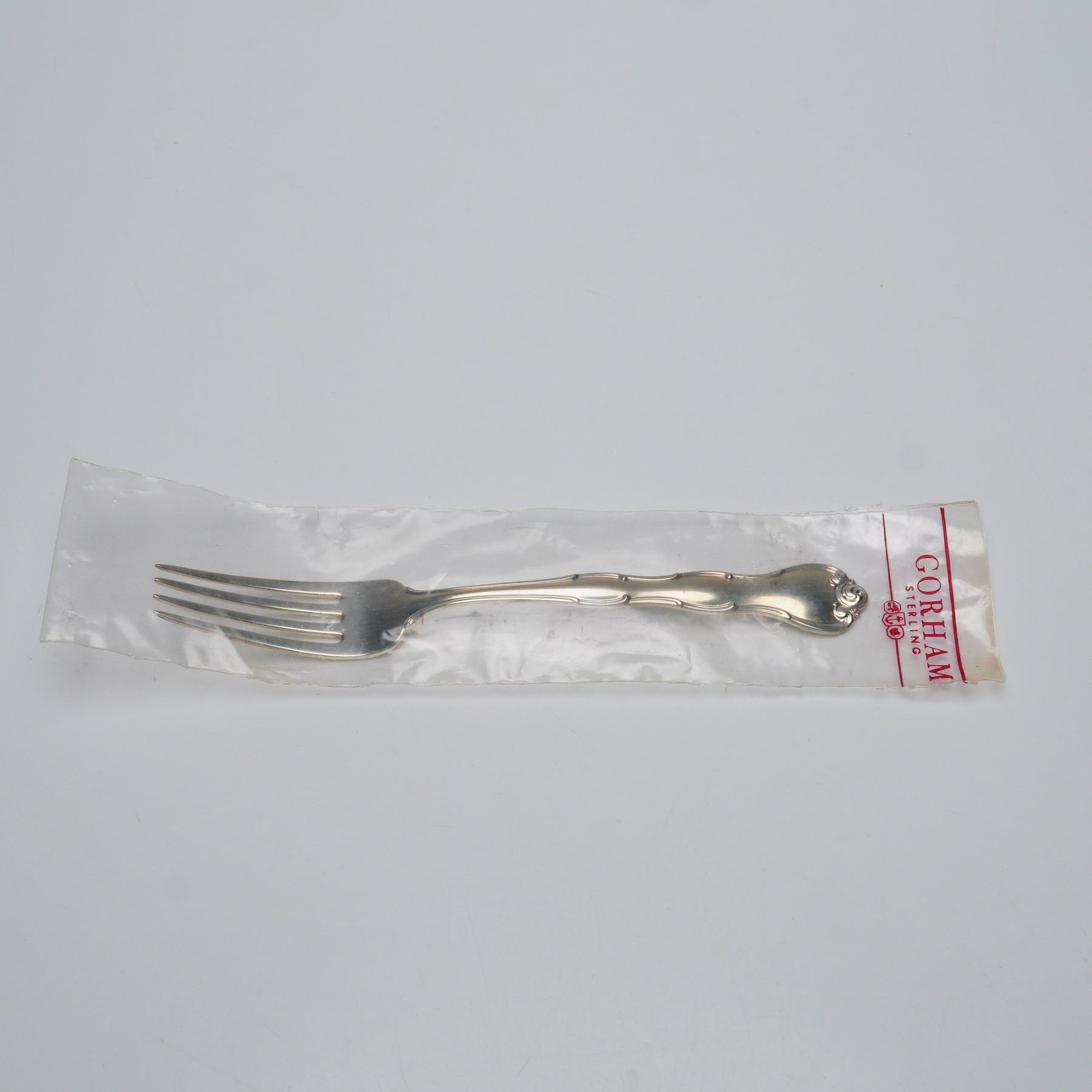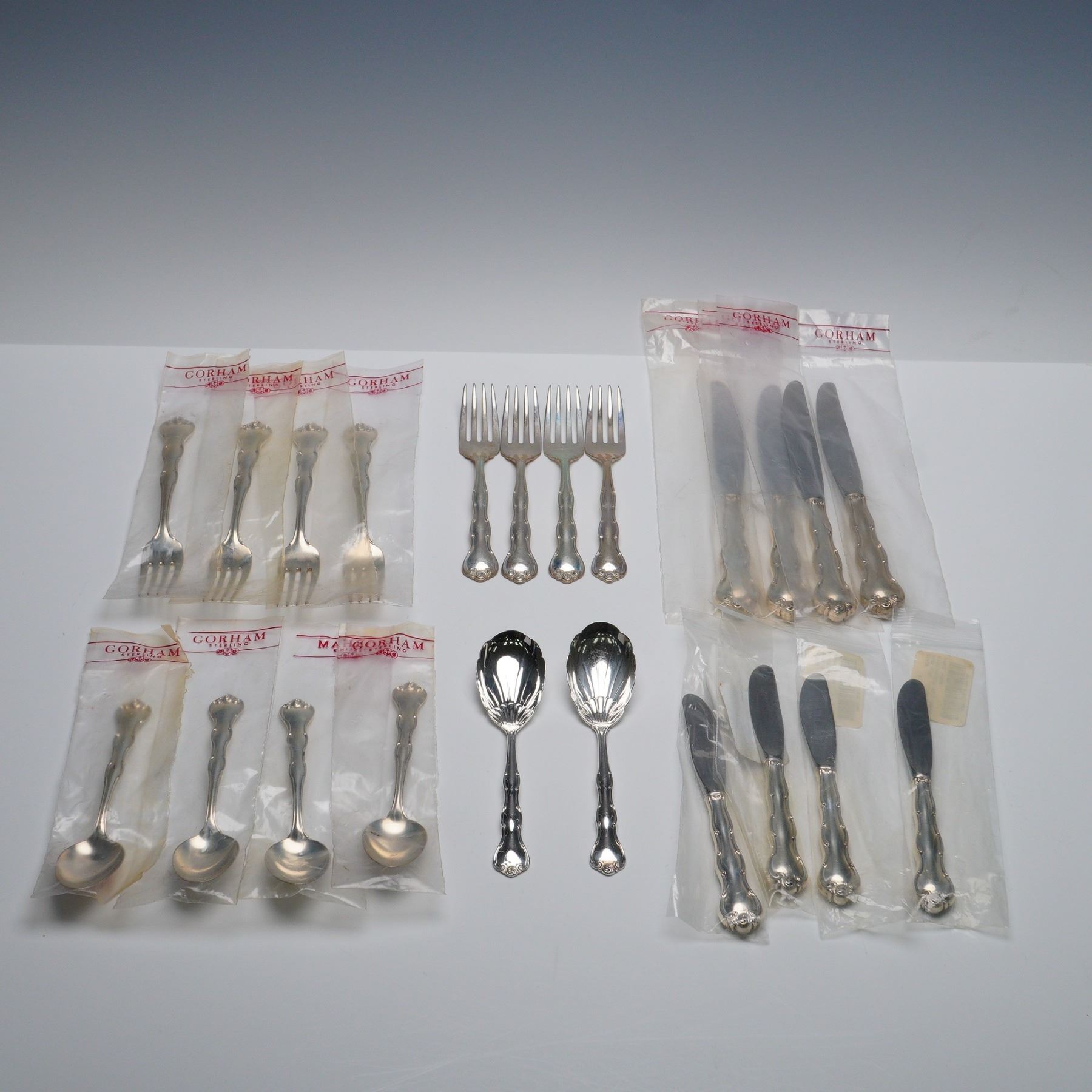 A 22-piece Gorham sterling silver flatware set in the Rondo pattern, providing service for four individuals. The set includes the following components: four dinner forks, four salad forks, four teaspoons, two sugar shell spoons, four dinner knives, and four butter spreader knives. The forks and spoons are stamped Gorham Sterling on the handles, indicating their solid sterling silver composition. The dinner knives and butter spreader knives feature sterling silver handles paired with stainless steel blades. Some of the pieces are sealed in original plastic sleeves labeled Gorham Sterling. The Rondo pattern is characterized by its symmetrical scallop and scroll motif, visible at the terminal of each handle. The included serving pieces - notably the sugar shell spoons - exhibit a shell-form bowl and decorative handle ends consistent with the set's design. Dinner fork: 7.25"L x 1"W. Salad fork: 6.5"L x 1"W. Teaspoon: 6"L x 1.25"W. Sugar shell spoon: 6"L x 1.5"W. Dinner knife: 9"L x 0.75"W. Butter spreader knife: 6.25"L x 0.75"W. The combined net silver weight of the forks and spoons is 17.06 troy ounces. The total gross weight of the dinner knives and butter spreader knives is 16.27 ounces. The stated weights do not account for the plastic protective covering.