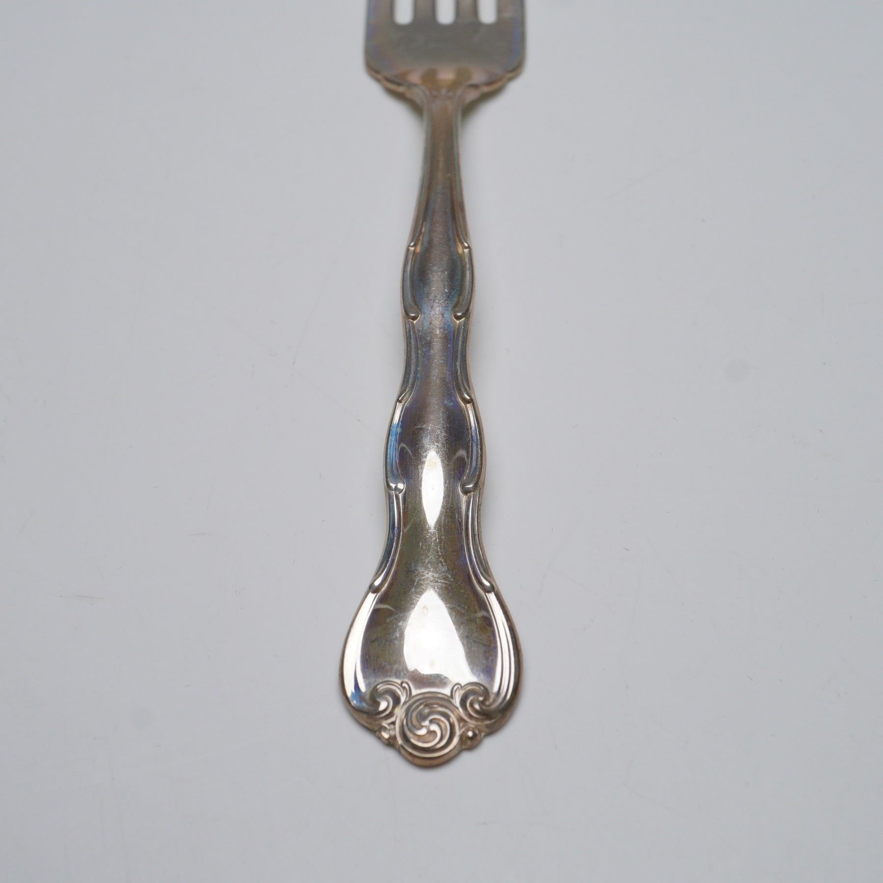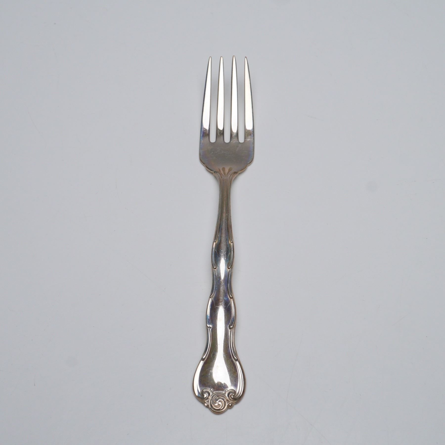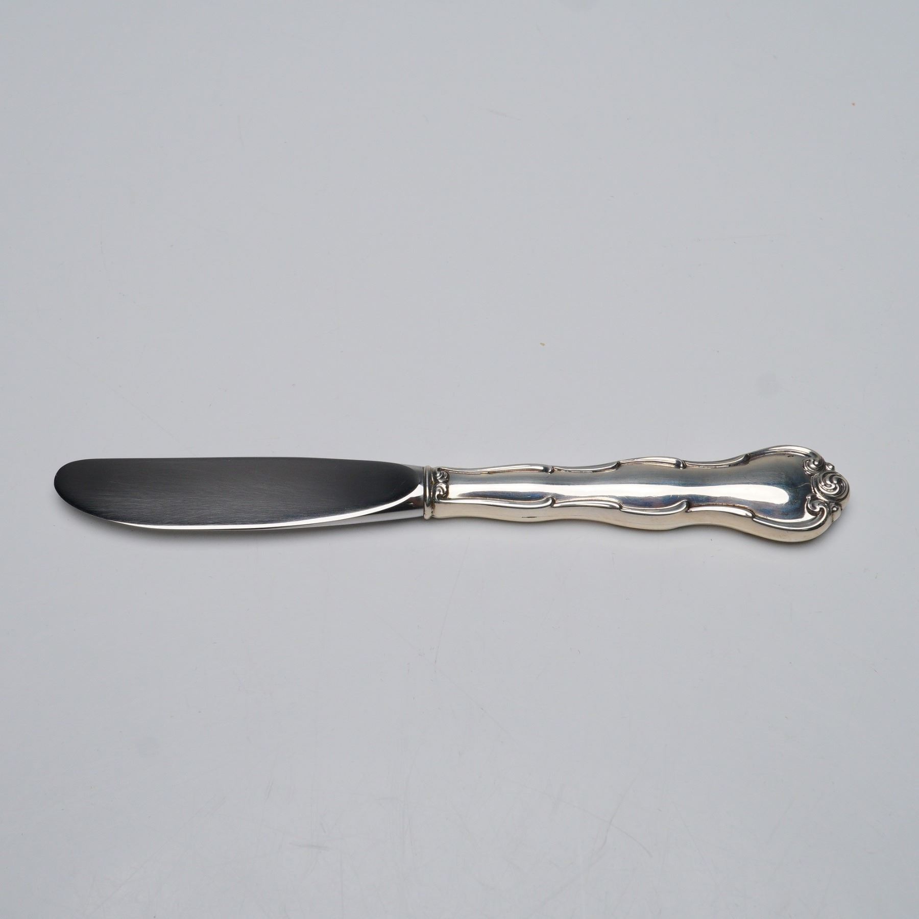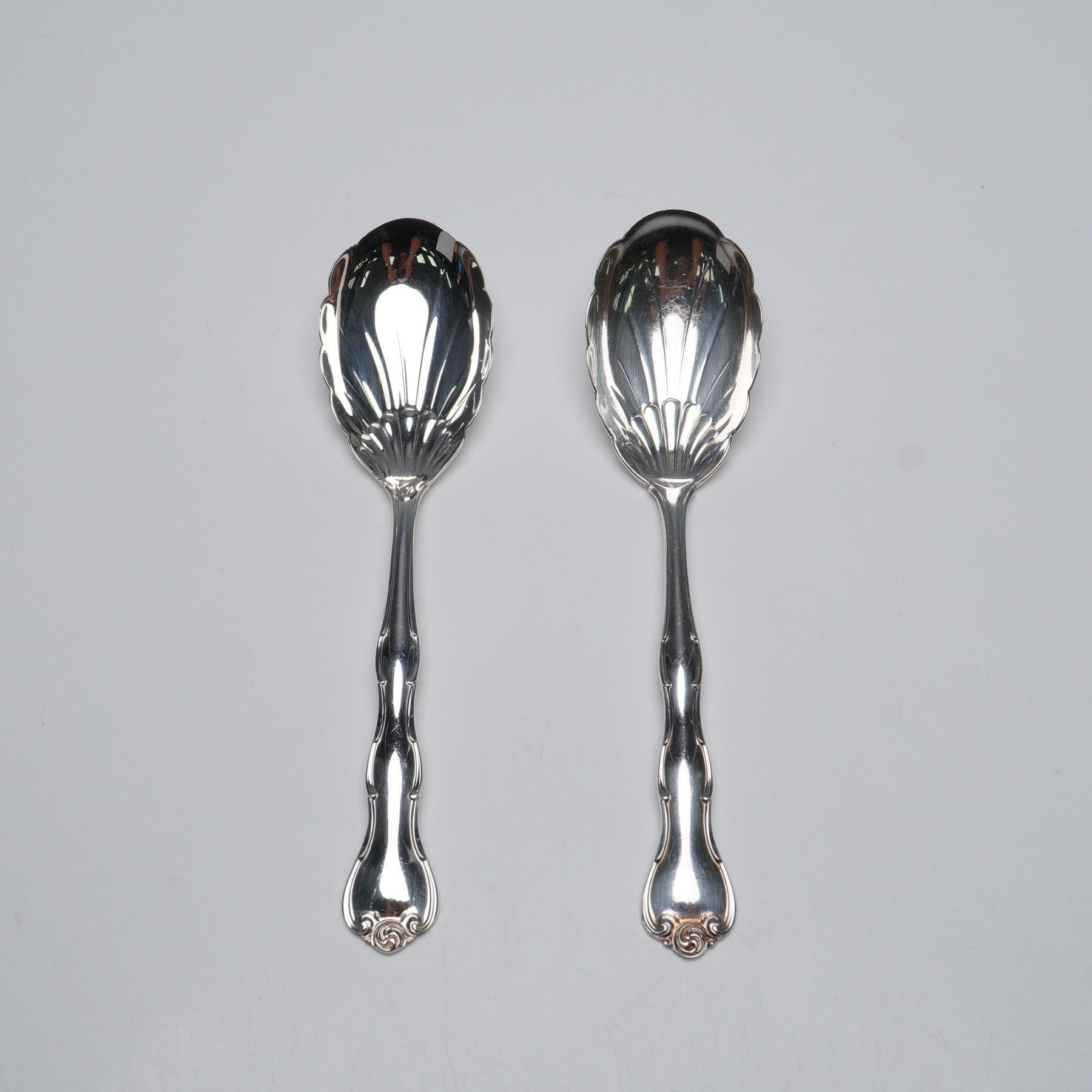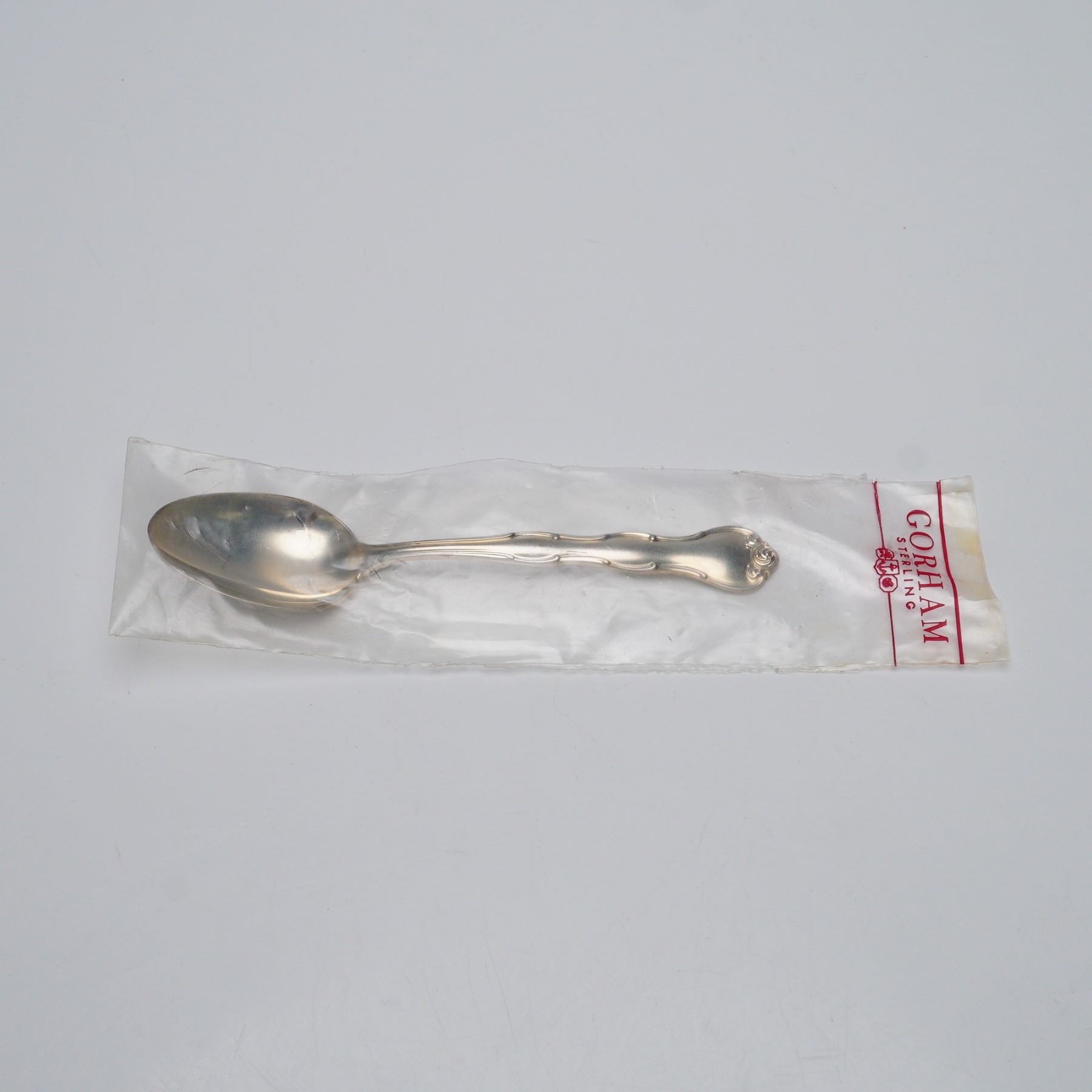A 22-piece Gorham sterling silver flatware set in the Rondo pattern, providing service for four individuals. The set includes the following components: four dinner forks, four salad forks, four teaspoons, two sugar shell spoons, four dinner knives, and four butter spreader knives. The forks and spoons are stamped Gorham Sterling on the handles, indicating their solid sterling silver composition. The dinner knives and butter spreader knives feature sterling silver handles paired with stainless steel blades. Some of the pieces are sealed in original plastic sleeves labeled Gorham Sterling. The Rondo pattern is characterized by its symmetrical scallop and scroll motif, visible at the terminal of each handle. The included serving pieces - notably the sugar shell spoons - exhibit a shell-form bowl and decorative handle ends consistent with the set's design. Dinner fork: 7.25"L x 1"W. Salad fork: 6.5"L x 1"W. Teaspoon: 6"L x 1.25"W. Sugar shell spoon: 6"L x 1.5"W. Dinner knife: 9"L x 0.75"W. Butter spreader knife: 6.25"L x 0.75"W. The combined net silver weight of the forks and spoons is 17.06 troy ounces. The total gross weight of the dinner knives and butter spreader knives is 16.27 ounces. The stated weights do not account for the plastic protective covering.