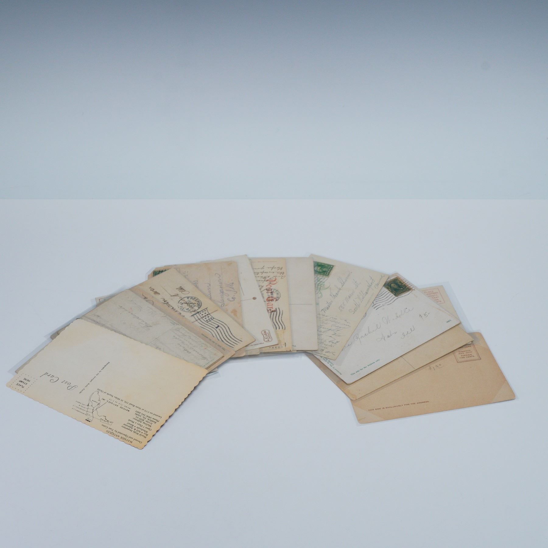Includes post cards from different states and cities such as Chicago Illinois, Baltimore Maryland, Springfield Missouri, St. Louis Missouri, Mobile Alabama, Virginia, and a postcard from Wayside Antiques located near Ocala, Florida. Includes colored and black-and-white examples. Several with handwritten correspondence and postage stamps. Some are housed in plastic sleeves for preservation.