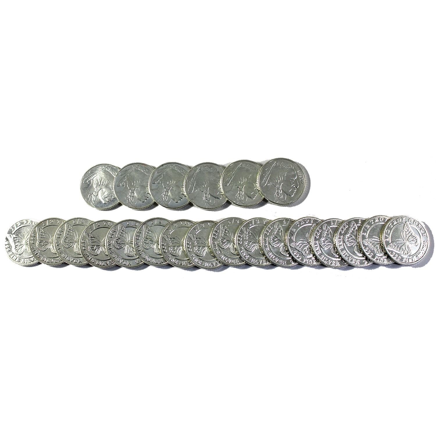 22x 1/2oz Monarch Precious Metals .999 Silver Rounds. Lot Includes: 16x Butterfly, & 6x Buffalo. 22pcs. (Tax Exempt)