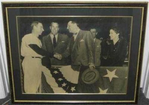 VINTAGE (CIRCA 1951) APPROX. 22X28" PHOTOGRAPH OF JOE DiMAGGIO GREETING GENERAL DOUGLAS MacARTHUR AND HIS WIFE. PHOTO WAS TAKEN AT YANKEE STADIUM ON MAY 21, 1951. YANKEES OWNER DAN TOPPING APPEARS IN PHOTO BETWEEN DiMAGGIO AND MacARTHUR. THIS PHOTO HAS BEEN PROFESSIONALLY FRAMED AND MATTED, AND AT ONE TIME WAS HUNG AND DISPLAYED IN THE OLD YANKEE STADIUM. ITEM PICTURED IS ACTUAL ITEM BUYER WILL RECEIVE. CLICK ON PHOTOS FOR CLEARER AND LARGER IMAGES. GREAT, AUTHENTIC NEW YORK YANKEES AND BASEBALL COLLECTIBLE!!! 1951 Joe Dimaggio with Douglas MacArthur / Final year for The Yankee Clipper ........... picture measures aprox {2ft.x2ft.} minor dings in the picture but overall rates 8 out of 10 / a one of a kind Type 1 photo that hung in the Exec. Lounge in The Old Yankee Stadium. $2500.00 takes it. Must have Special item for a Yankee or Joe D fan. You will be shocked just how good this is.