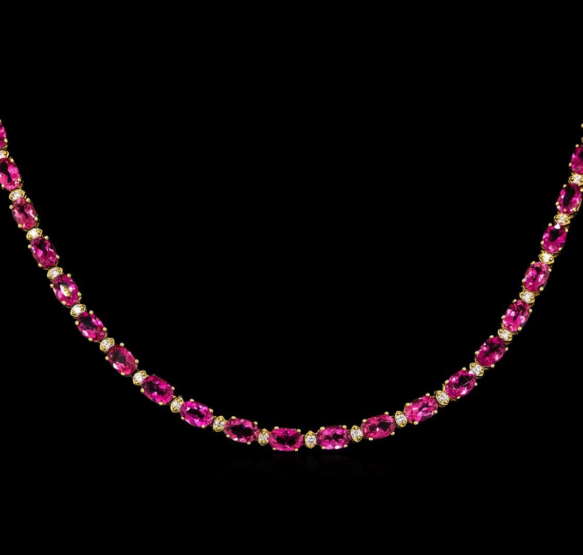 14K Yellow Gold 23CT Tourmaline 1.40CT Diamond Necklace. Description: Metal: 14k solid yellow gold. Face Measurements: 4 x 420mm. Size: 16.5. Finish: bright polish. Total Item Weight: 18.5 grams. Markings: stamped 14K. Country Made: USA. Main Stone: tourmaline. Quantity: 52. Shape: oval. Color: pink. Carat Total Weight: 23.00. Measurements: 4 x 6mm. Treatment: none. Setting: prong. Hue: pink. Saturation: moderately strong. Tone: dark. Clarity: type 2. Cut: very good. Secondary Stone: diamond. Quantity: 52. Shape: round. Color: white. Carat Total Weight: 1.40. Measurements: 1.9 - 2mm. Treatment: none. Setting: prong. Color Grade: H-I. Clarity: SI1-SI2. Cut: very good. Excellent Workmanship. Gemstones graded in the mounting. BHGL Appraised at $17,200.00.