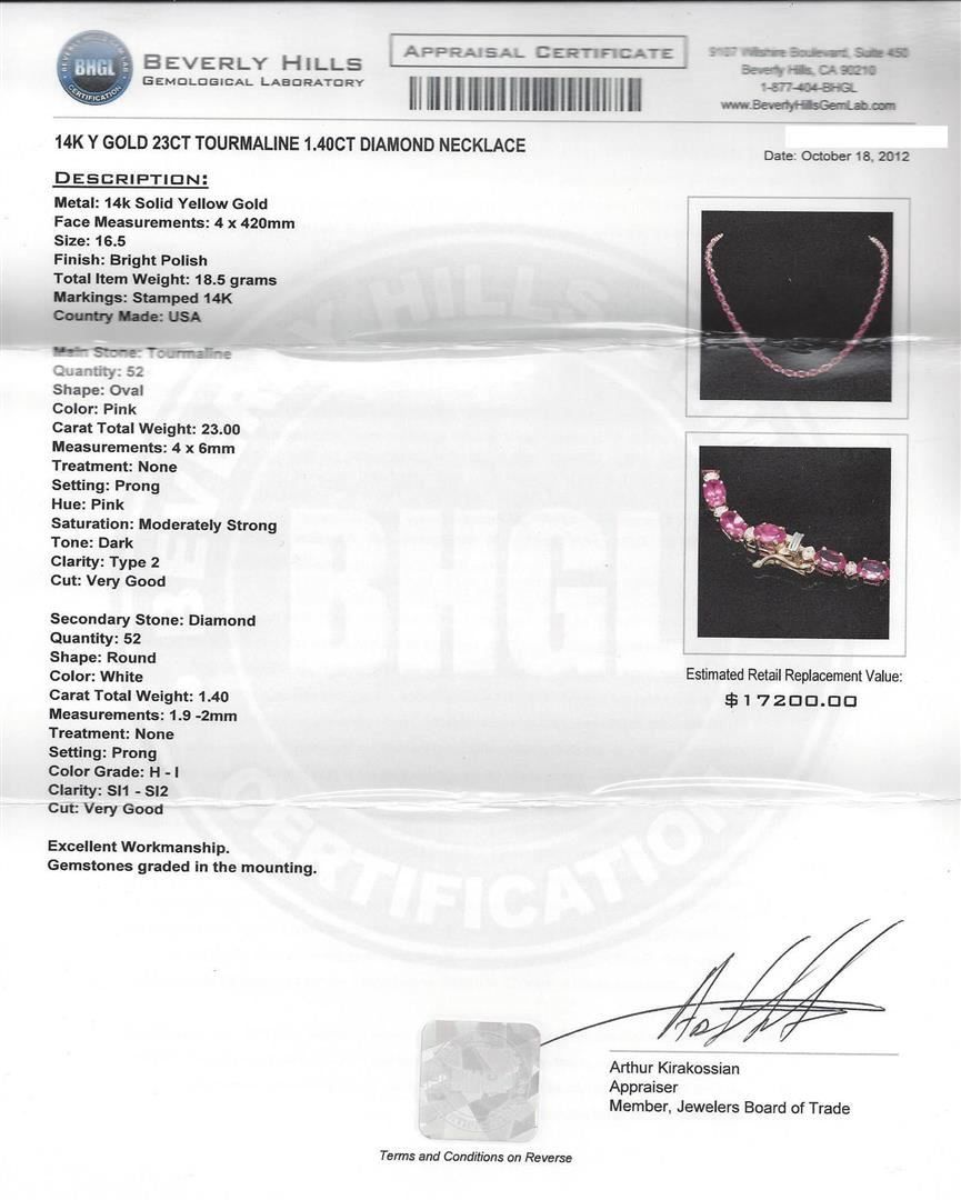 14K Yellow Gold 23CT Tourmaline 1.40CT Diamond Necklace. Description: Metal: 14k solid yellow gold. Face Measurements: 4 x 420mm. Size: 16.5. Finish: bright polish. Total Item Weight: 18.5 grams. Markings: stamped 14K. Country Made: USA. Main Stone: tourmaline. Quantity: 52. Shape: oval. Color: pink. Carat Total Weight: 23.00. Measurements: 4 x 6mm. Treatment: none. Setting: prong. Hue: pink. Saturation: moderately strong. Tone: dark. Clarity: type 2. Cut: very good. Secondary Stone: diamond. Quantity: 52. Shape: round. Color: white. Carat Total Weight: 1.40. Measurements: 1.9 - 2mm. Treatment: none. Setting: prong. Color Grade: H-I. Clarity: SI1-SI2. Cut: very good. Excellent Workmanship. Gemstones graded in the mounting. BHGL Appraised at $17,200.00.