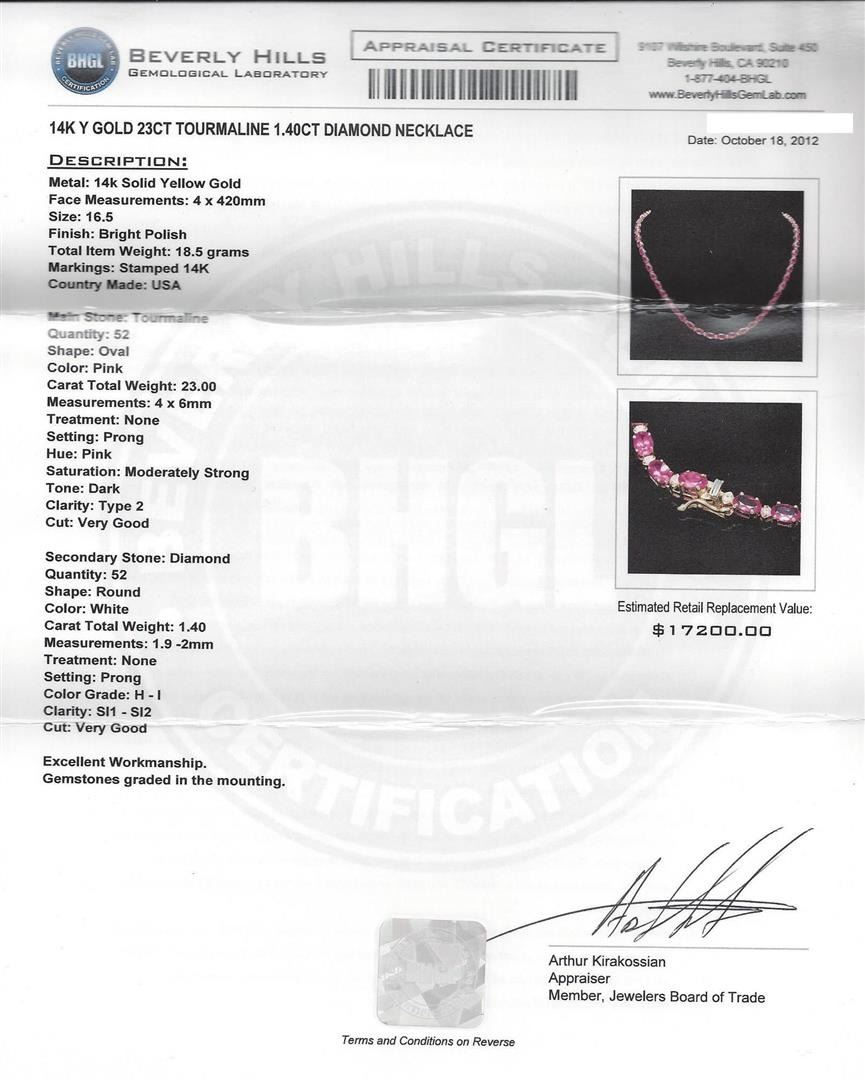 14K Yellow Gold 23CT Tourmaline 1.40CT Diamond Necklace. Description: Metal: 14k solid yellow gold. Face Measurements: 4 x 420mm. Size: 16.5. Finish: bright polish. Total Item Weight: 18.5 grams. Markings: stamped 14K. Country Made: USA. Main Stone: tourmaline. Quantity: 52. Shape: oval. Color: pink. Carat Total Weight: 23.00. Measurements: 4 x 6mm. Treatment: none. Setting: prong. Hue: pink. Saturation: moderately strong. Tone: dark. Clarity: type 2. Cut: very good. Secondary Stone: diamond. Quantity: 52. Shape: round. Color: white. Carat Total Weight: 1.40. Measurements: 1.9 - 2mm. Treatment: none. Setting: prong. Color Grade: H-I. Clarity: SI1-SI2. Cut: very good. Excellent Workmanship. Gemstones graded in the mounting. BHGL Appraised.