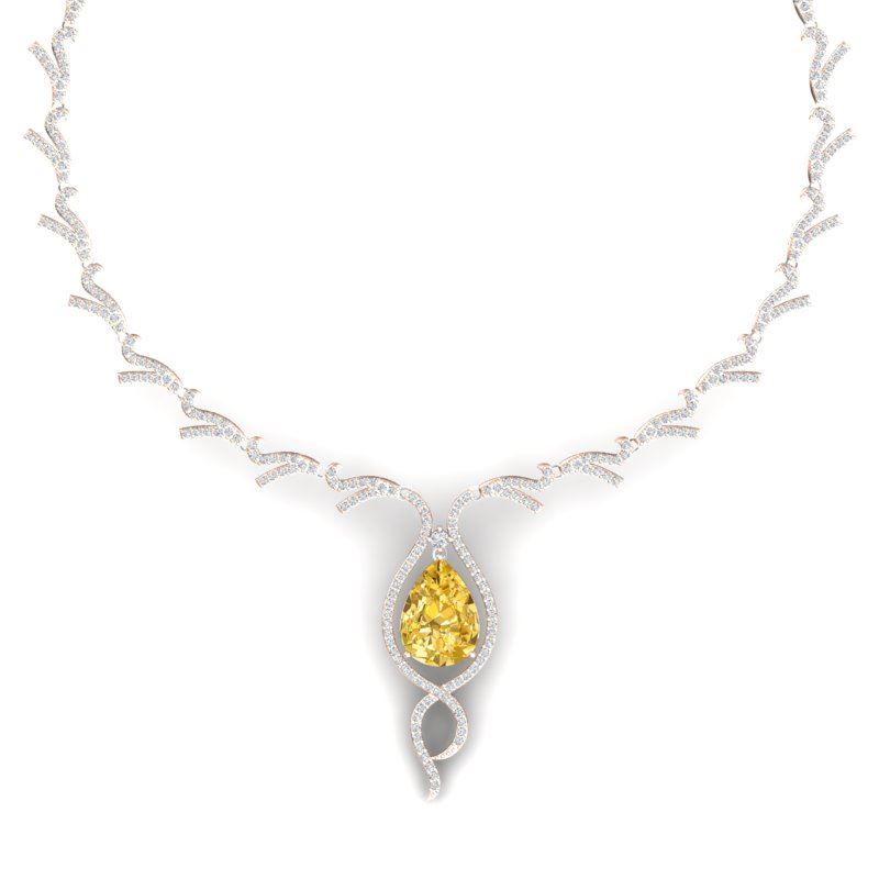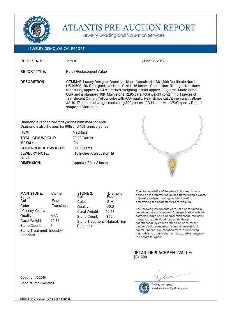 23.02 CTW Royalty Canary Citrine & VS Diamond Necklace 18K Rose Gold ---- Luxury Designer Brand Necklace Appraised Retail Price at $61,600 ---- SKU Number US39508 18K Rose gold Necklace Size is 16 Inches, Can custom fit length, Necklace measuring approx. 4 3/4 x 2 Inches, weighing in total approx. 30 grams. Made in the USA and is stamped 18K, Main stone 12.85 carat total weight containing 1 pieces of Translucent Canary Yellow color with AAA quality Pear shape cut Citrine Fancy , Stone #2 10.17 carat total weight containing 399 pieces of G-H color with VS/SI quality Round shape cut